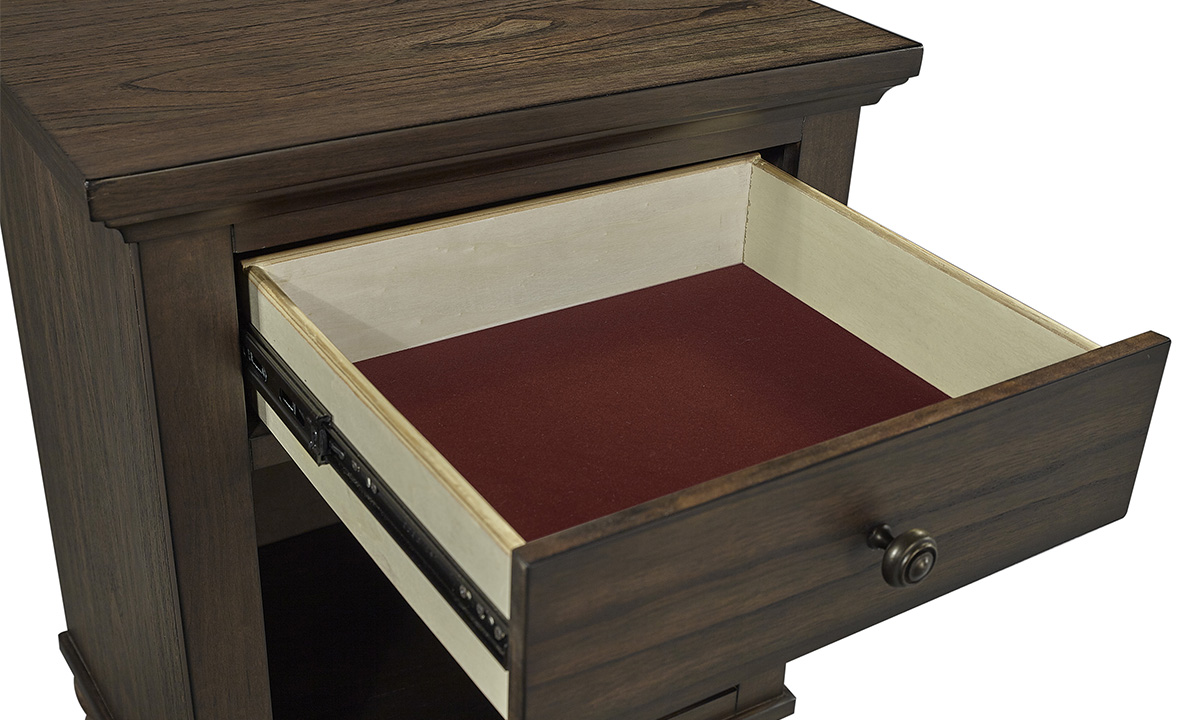 Discover the perfect blend of style and functionality with the Hudson Chestnut 1-Drawer Nightstand. Crafted with select hardwoods and mindi veneer, this nightstand boasts a rich chestnut finish that adds warmth and sophistication to your bedroom. The dovetail joinery signifies exceptional craftsmanship and durability, ensuring a piece that's built to last. The drawer is cedar-lined, providing natural protection for your belongings and a touch of luxury. The premium, full-extension steel ball-bearing drawer slides offer smooth and effortless access, enhancing the nightstand's practicality. This nightstand is not just a convenient bedside companion but a tasteful addition to the Hudson Valley collection, designed to bring a casual yet traditional elegance to your home.