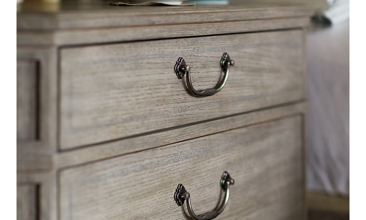 Elevate the style and functionality of your bedroom with the Bernhardt Marquesa Cashmere 3-Drawer Nightstand. This elegant nightstand combines classic design elements with a modern touch to create a piece that is both beautiful and practical. Crafted with a Gray Cashmere finish, the nightstand exudes warmth and sophistication, making it a perfect addition to any bedroom decor. The White Oak Veneer construction ensures durability and longevity, ensuring that this piece will be a staple in your home for years to come. The nightstand features three spacious drawers, providing ample storage space for all of your nighttime essentials. The drawers are designed with adjustable glides, ensuring smooth and easy access to your belongings. In addition to its functional features, the Bernhardt Marquesa Cashmere 3-Drawer Nightstand also boasts a sleek and stylish design. The clean lines and elegant finish make this nightstand a standout piece that will enhance the overall look of your bedroom. Whether you're looking for additional storage space or a stylish accent piece, the Bernhardt Marquesa Cashmere 3-Drawer Nightstand is a perfect choice.