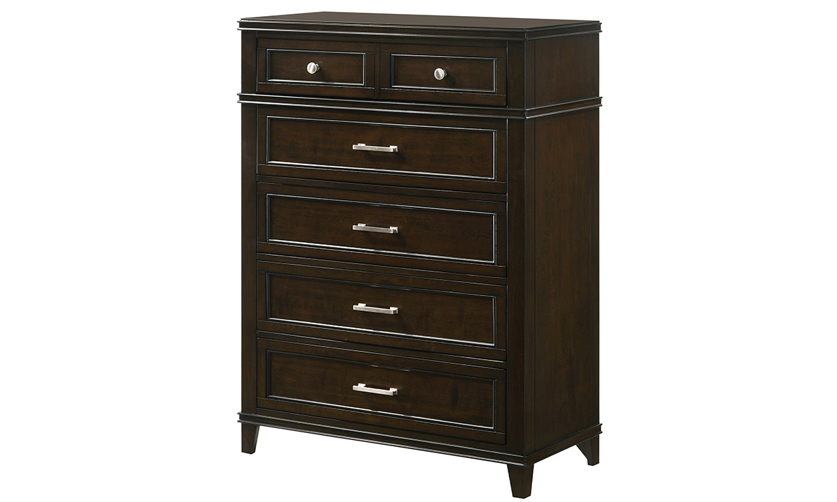 Finished in a rich cherry tone, the chest exudes warmth and sophistication. The cherry finish beautifully highlights the natural grains of the poplar solids and birch veneers, creating a timeless appeal that complements any bedroom style. The chest features five spacious drawers, offering plenty of room to store your clothing, accessories, and other essentials. Whether it's folded garments, accessories, or personal items, you can keep everything organized and easily accessible. The smooth ball bearing drawer guides ensure smooth and quiet operation when opening and closing the drawers. The sturdy construction and high-quality materials ensure long-lasting durability, making this chest a practical investment for your bedroom. In addition to its functional design, the Waterpointe Cherry 5-Drawer Chest adds a touch of elegance to your space. The clean lines and traditional details create a refined look that effortlessly blends with various decor styles.