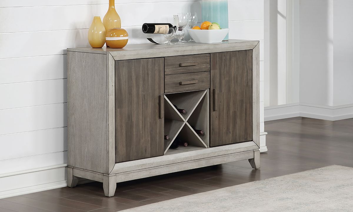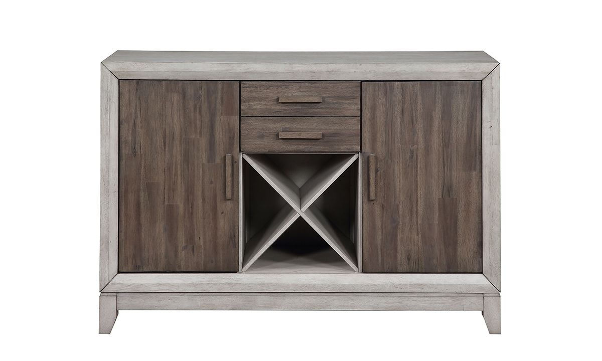 Complete your dining room ensemble or add a stylish, modern storage option to entryway, kitchen or entertainment space with the Abacus Alabaster and Honey Sideboard. Crafted from Acacia and Asian hardwoods, the modern, angular profile is balanced by a rustic two-tone Smoky Alabaster and Honey wood finish, inspired by classic farmhouse dining tables. Two central storage drawers, the top featuring protective felt-lining, are flanked by two spacious storage cabinets, each concealing two interior shelves to keep all your entertaining essentials neatly tucked away. A central wine rack keeps all your favorite beverages on hand and can be removed to use for additional storage or display space.