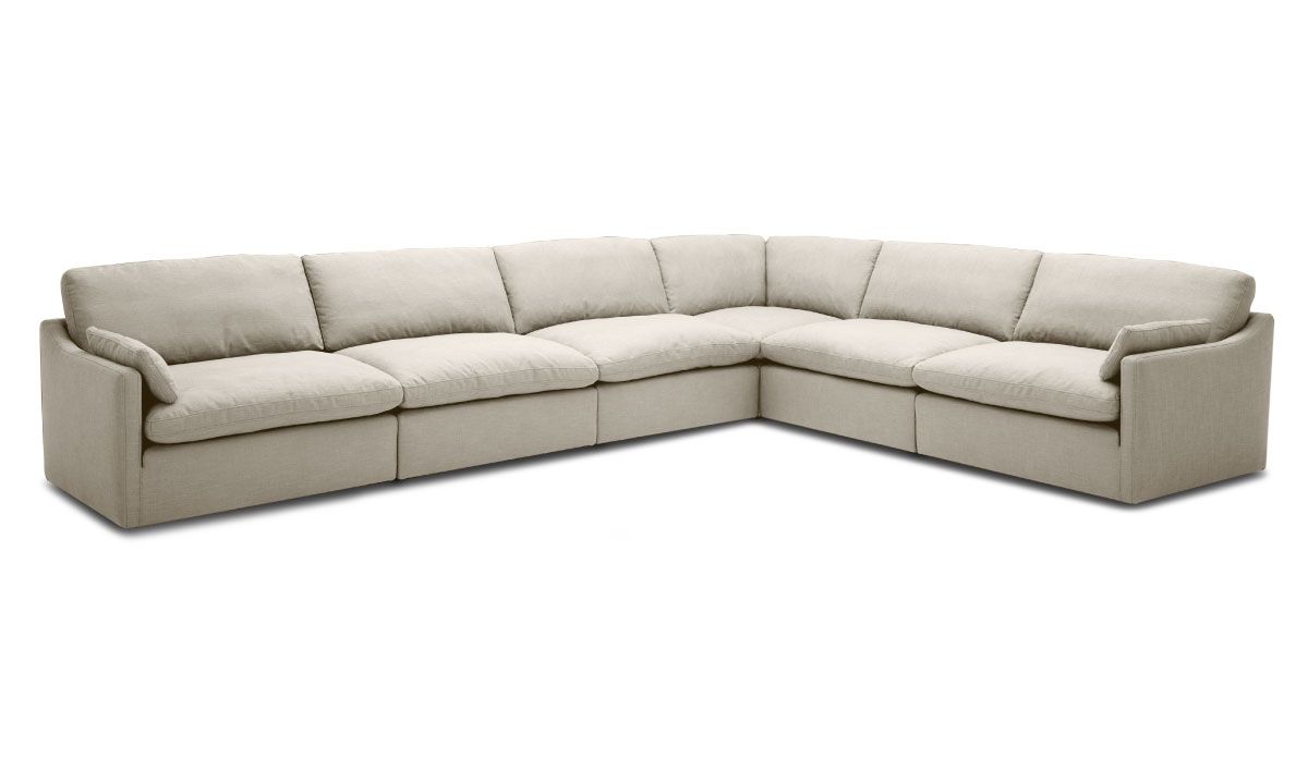 Modular six-piece sectional features a contemporary silhouette and versatile linen-colored fabric upholstery for a clean, crisp take on a classic.