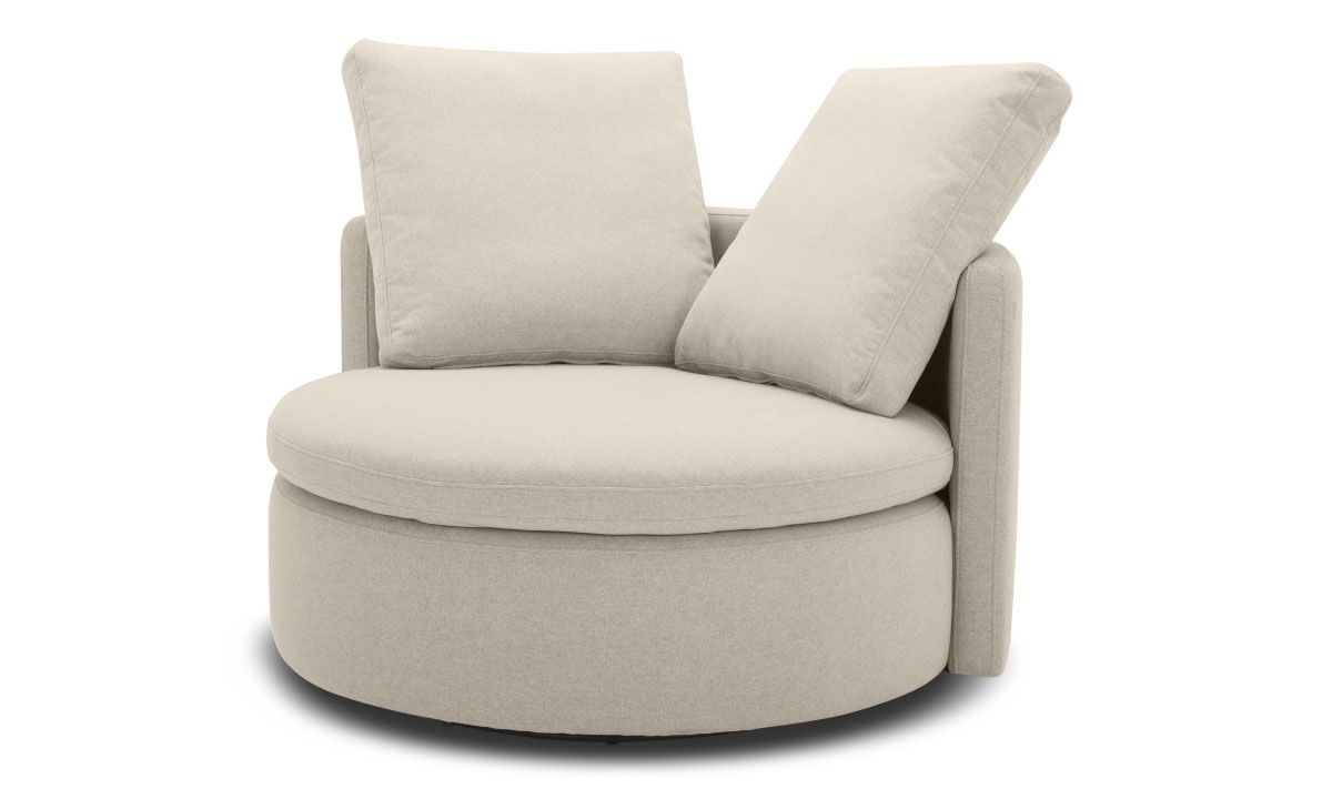 This round swivel chair in a linen fabric offers a versatile and comfortable way to relax at the end of each day. Crafted with luxury materials like high grade fabric upholstery, a hardwood frame and sinuous spring support system, this accent chair was built with lasting value in mind. With two matching throw pillows for additional comfort, you'll love this unique seat from Caliber.