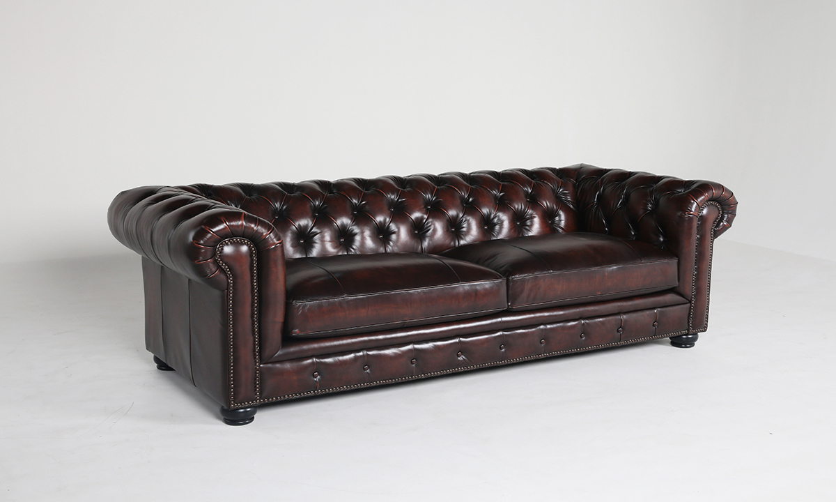 Make room for rich looking and low pricing with the factory direct and timeless Chesterfield style sofa made from brown top grain leather with vinyl match back and outer sides, roll arm design, nail head trim and rubber wood legs.
