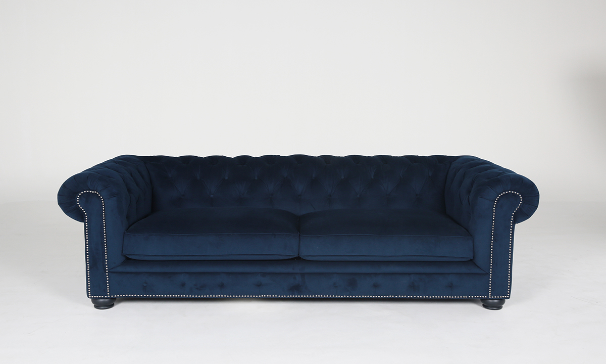 Make room for on-trend and underpriced with the factory direct Midnight Velvet blue Chesterfield style two-piece living room set. The sofa and armchair are upholstered in midnight velvet polyester blend fabric, and detailed with a roll arm design, nail head trim and rubber wood legs.
