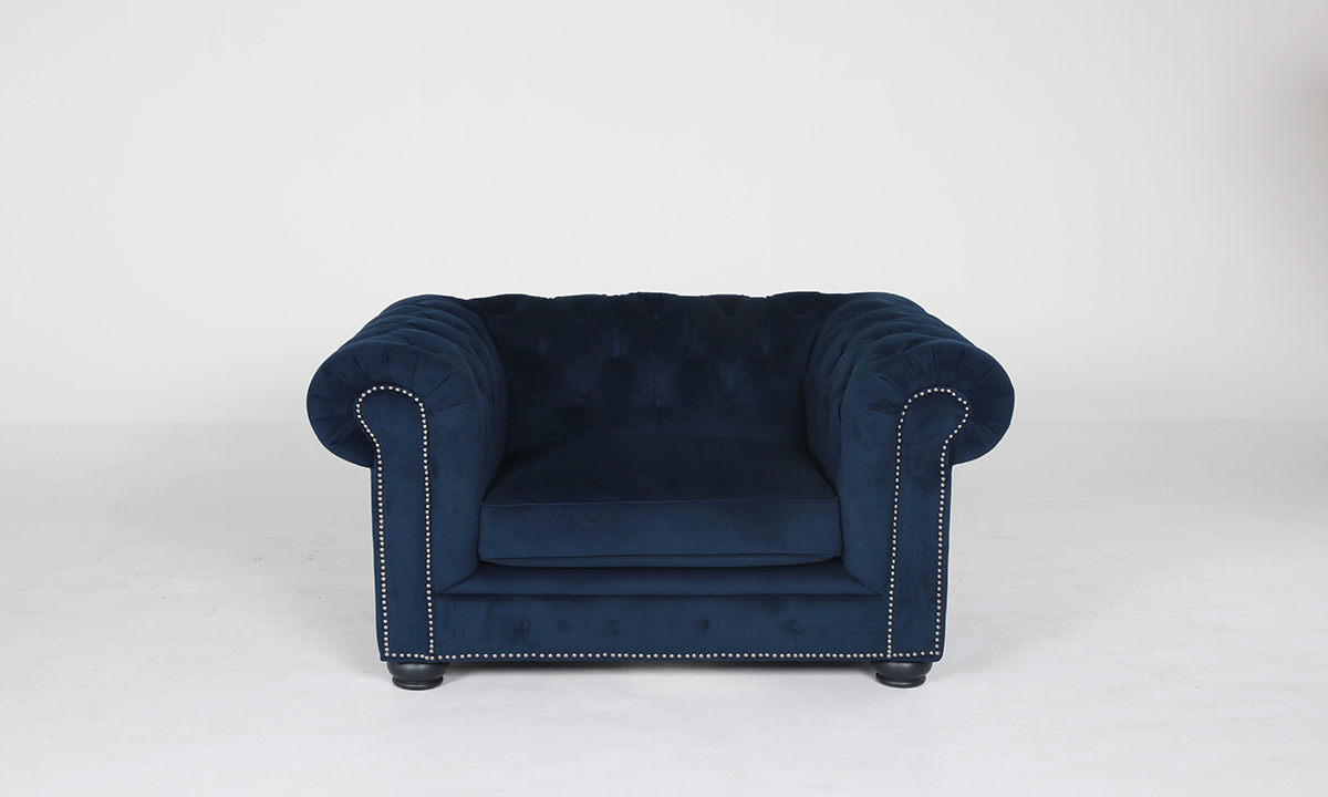 Make room for the on-trend and underpriced factory direct Chesterfield style armchair, upholstered in midnight velvet blue polyester blend fabric, and detailed with a roll arm design, nail head trim and rubber wood legs.