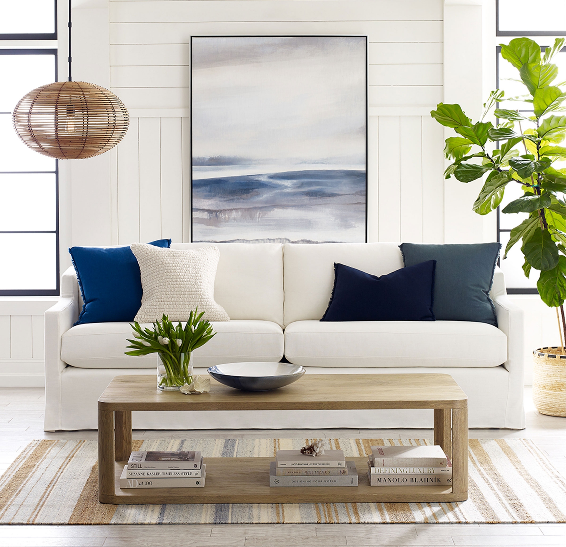 Discover a fresh, modern coastal aesthetic with the Cade Cocktail Table by Mitchell Gold + Bob Williams. Crafted from reclaimed oak and oak veneer, this piece boasts a natural light finish that highlights the unique grain for a charmingly rustic look. Versatile and stylish, it's an ideal addition to your living room, study, or entryway and complements the coordinating console and side tables in the collection.