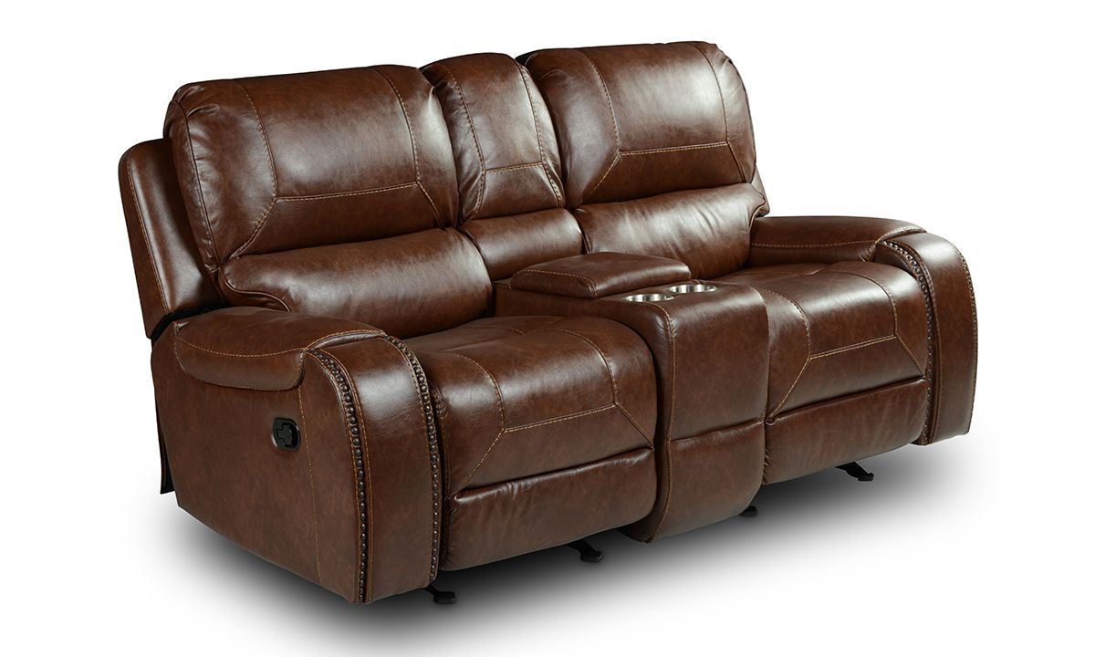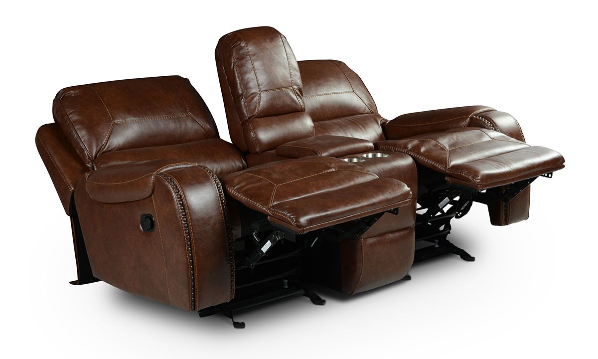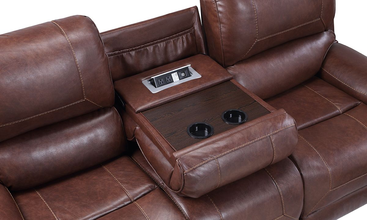 Upgrade your living room relaxation levels with the superior comfort and unforgettable style of the Caspian Brown 3-Piece Reclining Living Room Set. A perfect balance of form and function, the sofa, loveseat and rocker recliner included in the set all feature warm brown leather-look fabric upholstery tailored in unique baseball stitch accents and antiqued brass nail head trim. Loaded with features, the double reclining sofa boasts a central drop-down table which includes two cupholders, a wood grain table surface, storage pouch and pop-up power station with two power outlets and two USB charging ports. Not to be upstaged, the matching loveseat also features a central storage console with two cupholders, a power outlet and two USB charging ports while the manual recliner grants total freedom of movement thanks to the relaxing rocker mechanism and 360° swivel motion.