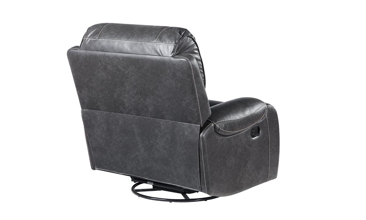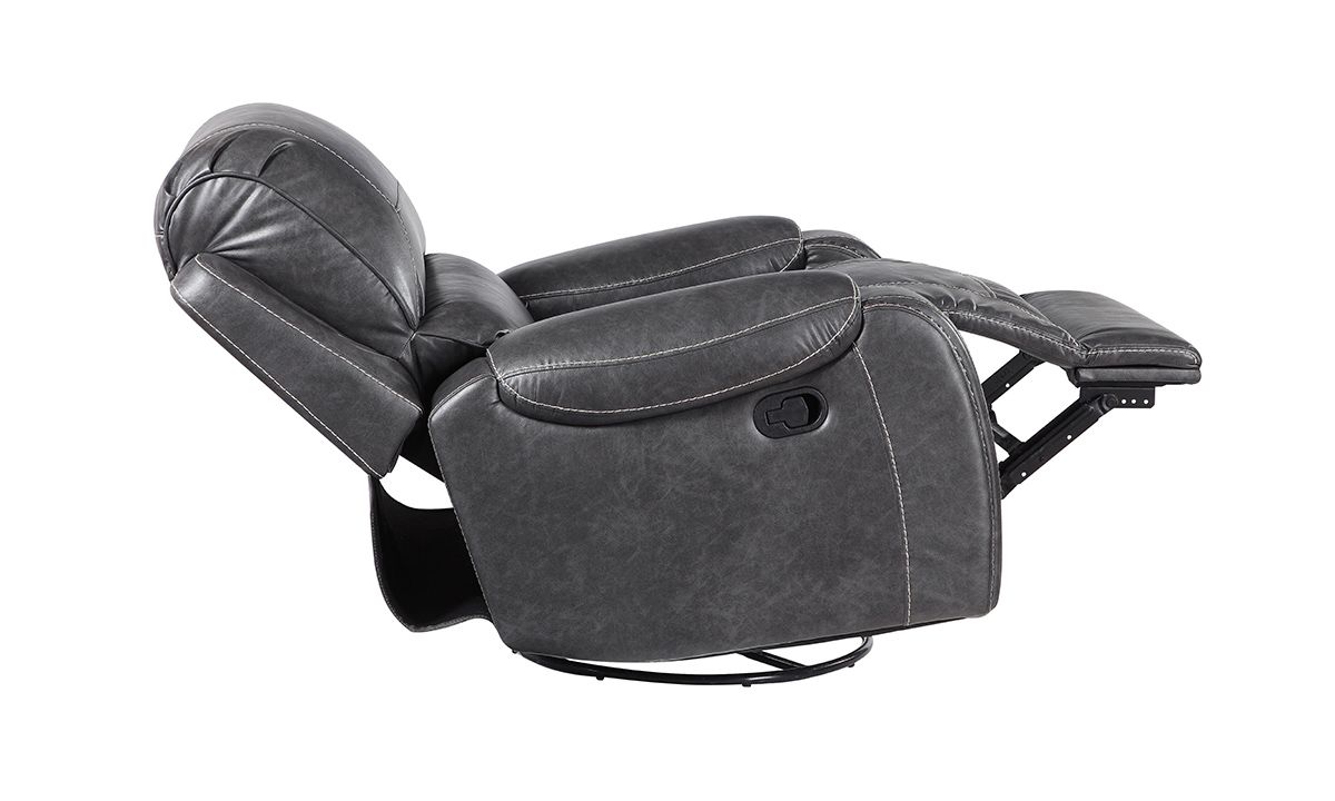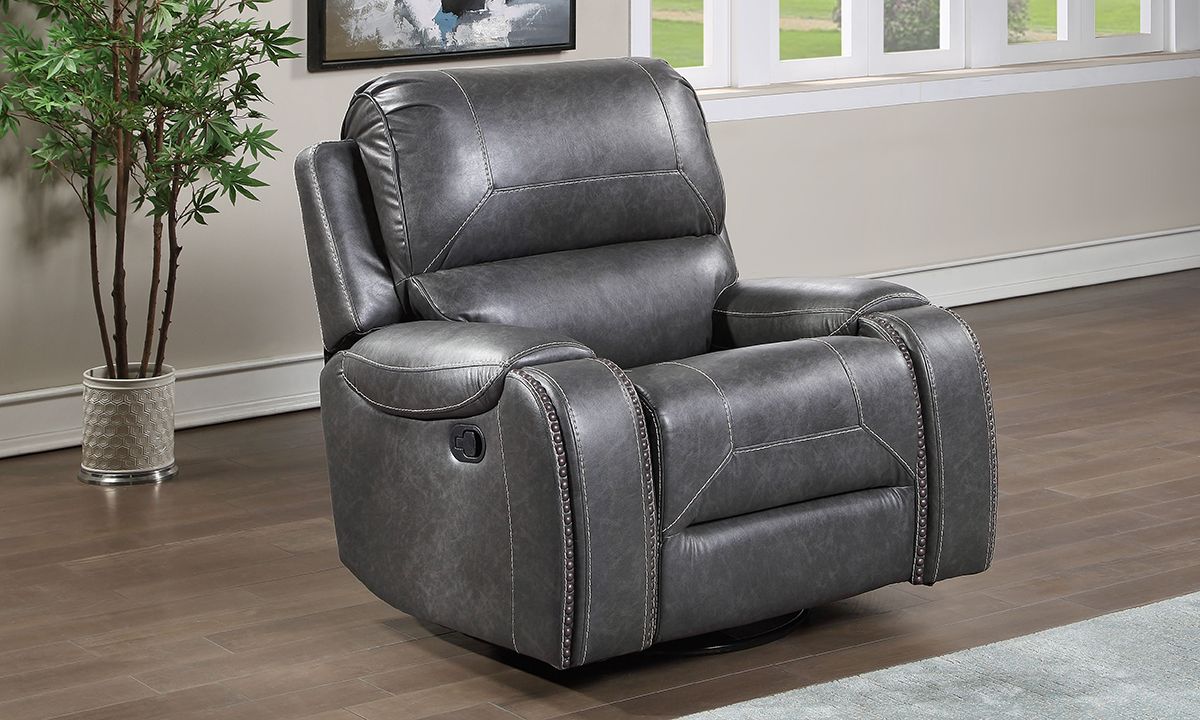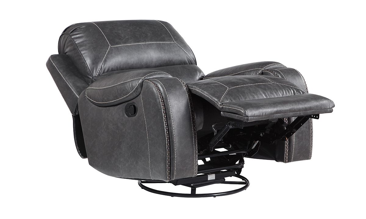 Swivel, rock or recline in style with the loaded features and sleek design of the Caspian Grey Swivel Rocker Recliner. A perfect balance of form and function, this spacious 42-inch wide manual recliner features smooth grey leather-look fabric upholstery tailored in unique baseball stitch accents and pewter nail head trim. Enjoy the smooth rocking motion or 360° swivel spin with a gentle push or use the easy pull hand release-lever located on the outer right arm to ease into a relaxing reclined position.