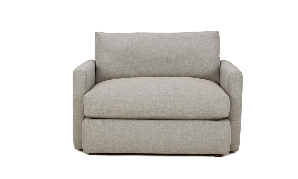 Understated armchair marries a low-back, contemporary silhouette with casual silver fabric upholstery and other eco-friendly materials.