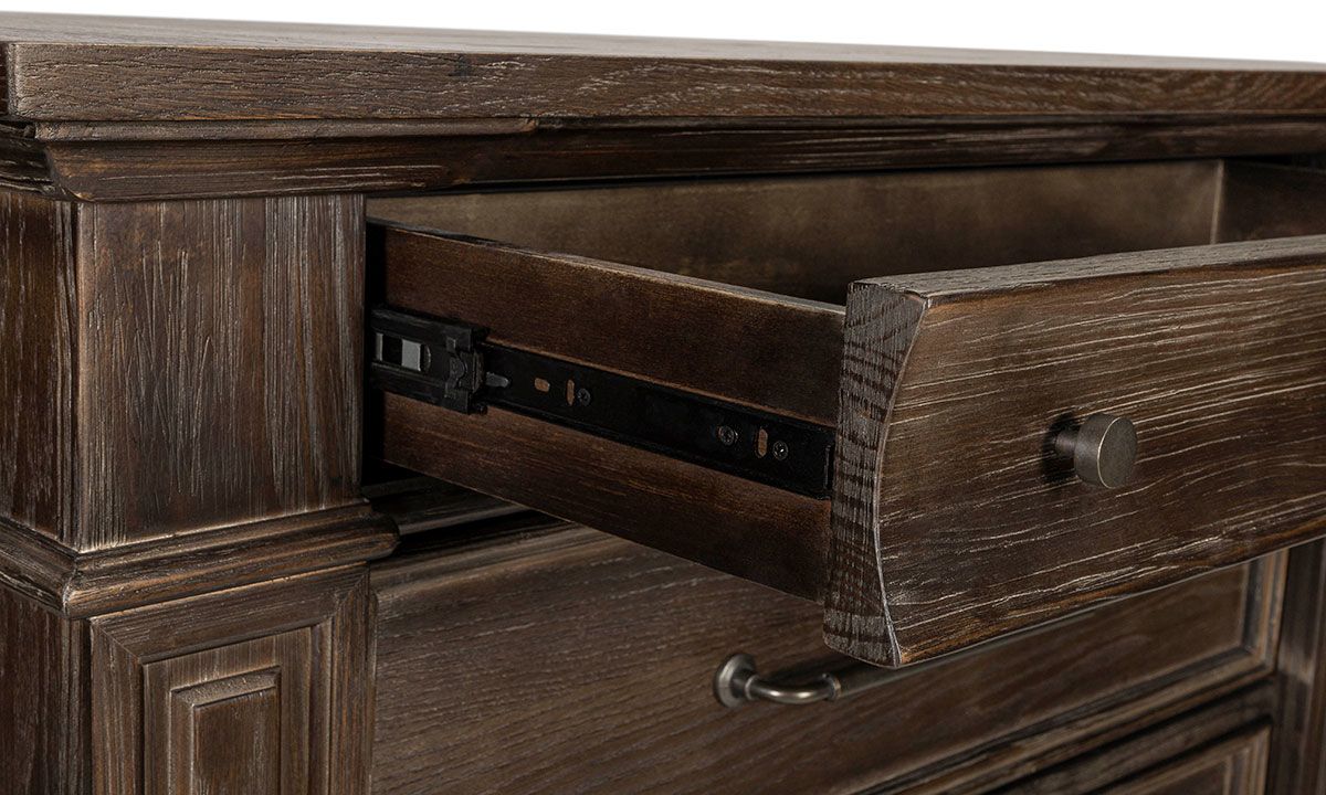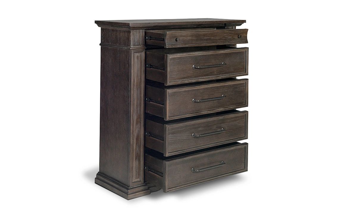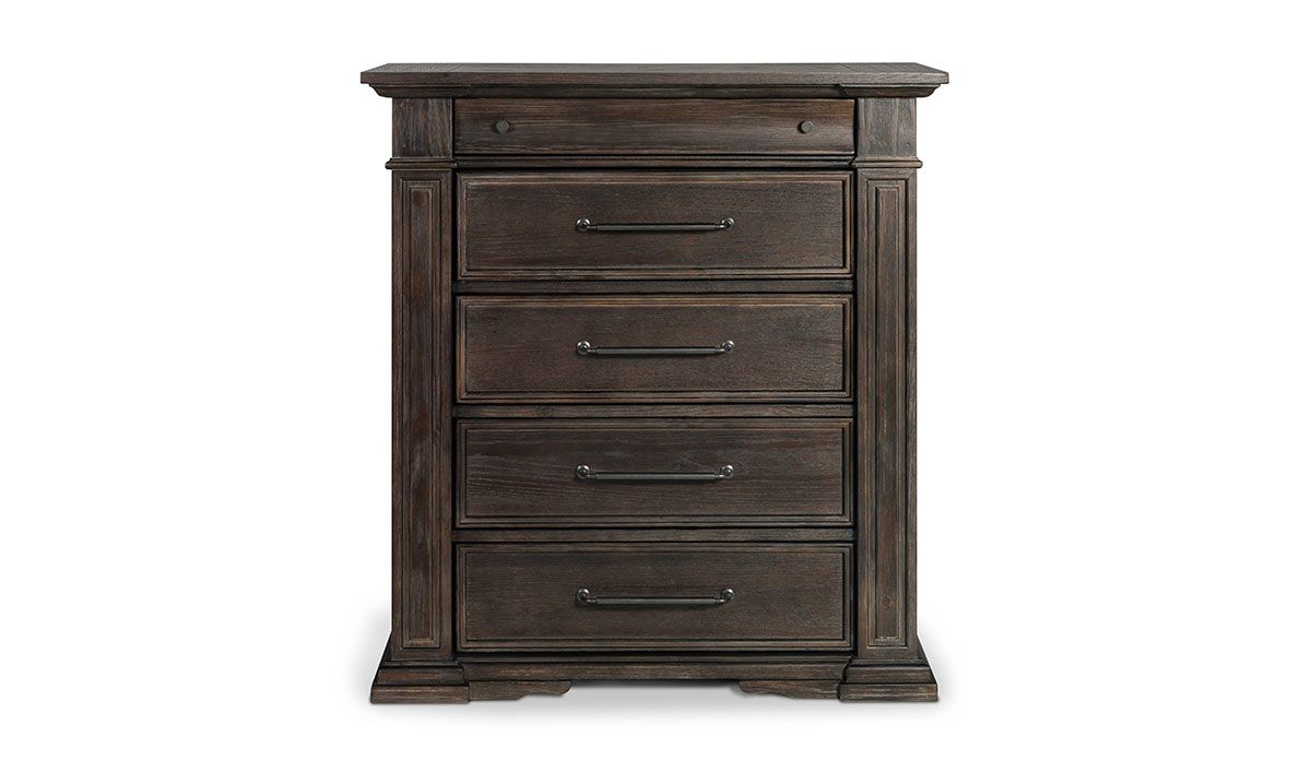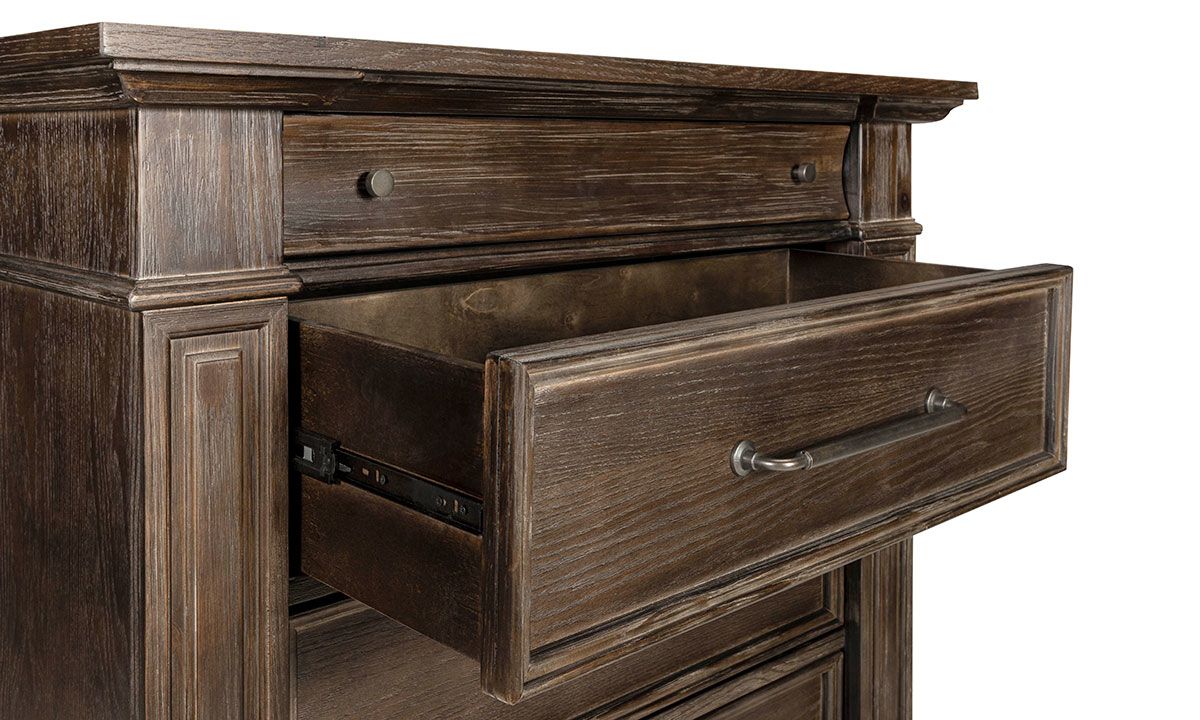 The finishing touch on your master bedroom ensemble, the Coopers Beach Bark 5-Drawer Chest offers a practical storage solution with heirloom-quality appeal. Crafted to last from hardwood solids and Oak veneers, this lofty 53-inch tall vertical chest updates the timeless design, complete with heavy crown molding and fluted trim accents, with generous, oversized scaling and modern construction for top-notch looks and functionality. The rich Bark Brown wood finish employs a heavily distressed, wire brushed treatment to lend a casual, contemporary feel to the classic design while highlighting the natural graining of the flat cut Oak veneers, and is complemented by the custom knob and bar pull hardware adorning the drawer fronts.