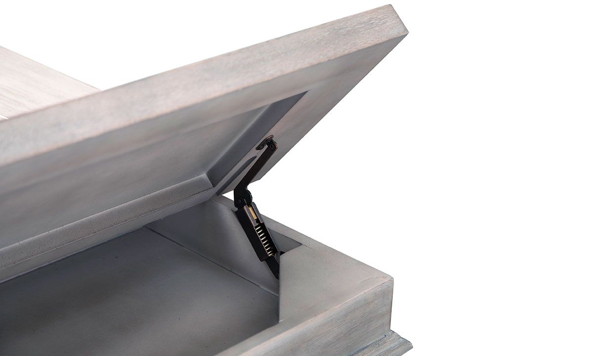 The style-meets-value Dining Table features flip-top storage at table ends, turned leg detail and a plank-effect tabletop, made from Rubberwood solids and Acacia veneers with Fieldstone gray finish.