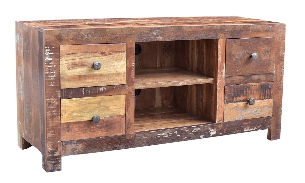 Bohemian media console crafted in India showcases the one-of-a-kind color variations and natural distressing of reclaimed wood.