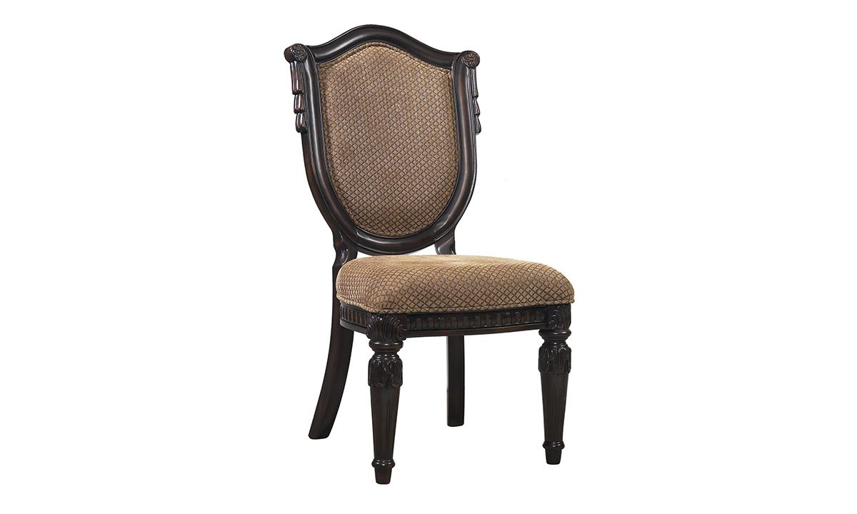 Capturing the elegant craftsmanship of old world, European designs, the Carnegie Manor II 5-Piece Dining Set with Upholstered Side Chairs breathes new life into the traditional style for an inviting look steeped in heirloom-quality sophistication. Crafted from Poplar solids and Prima Vera veneers with stunning Walnut inlays, the 60-inch round table and four armless side chairs included in the set feature a warm and welcoming Dark Cinnamon finish. A modernized take on classic old world styling, the table pairs a contemporary 5-inch thick glass top with an eye-catching pedestal base featuring Walnut panels framed in fluted pilasters leading up to four intricately carved corbels. Completing the ensemble, the four included side chairs echo the same detailed carvings found on the table and feature a fabric upholstered seat and back with a striking wood shield panel finished with a classic swag carving.