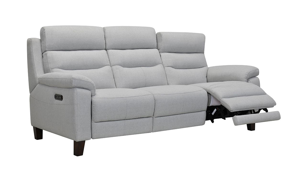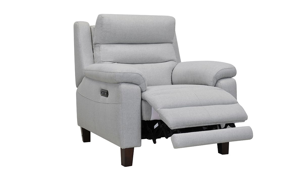 With the looks of a designer accent chair and the comfort and functionality of a high-end recliner, the Jessica Jacobs Bergamo Stone Power Recliner offers the best of both worlds. Distinguished by a modern double bustle back profile, sculptural foldover armrests and contemporary tapered wood legs, the tailored stone grey fabric upholstery lends a luxurious finishing touch to this 40-inch tall recliner. Personalizing your reclined and headrest position is as easy as the push of a button thanks to the convenient push button control panel located on the outer right arm which comes complete with a USB charging port.