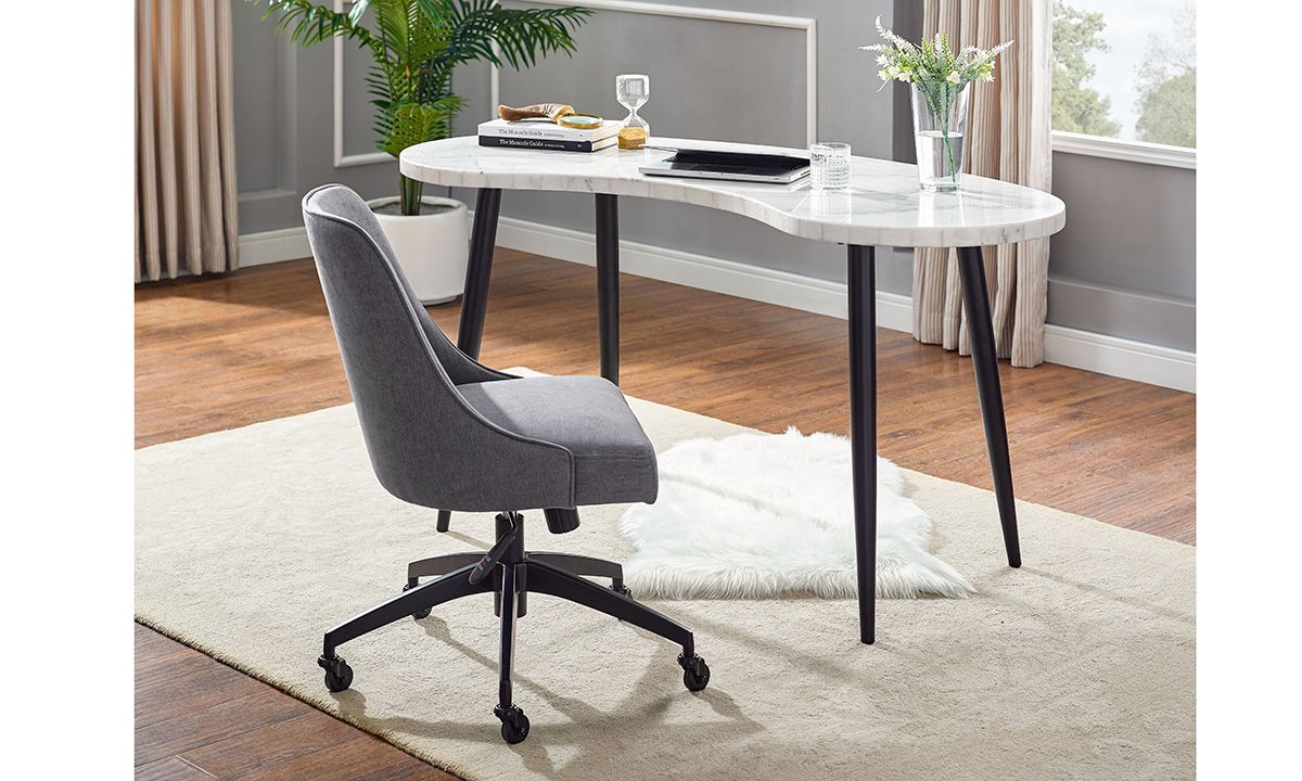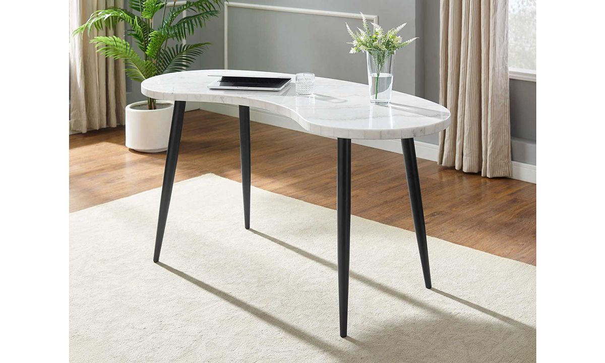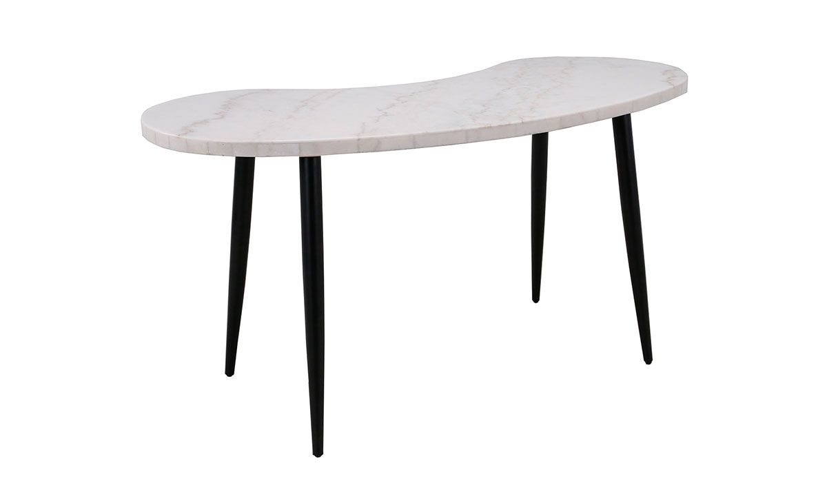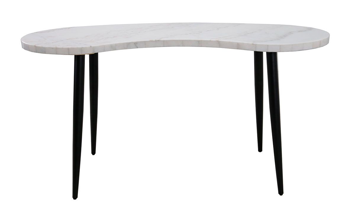 Add some luxe, retro-inspired personality to your home office, bedroom or living space with the Kinsley White Marble Kidney Shape Desk. A stunning white marble top in a mid-century inspired kidney shape sits atop iron canted legs on a modern Ebony finish for a stylish marriage of retro and modern décor.