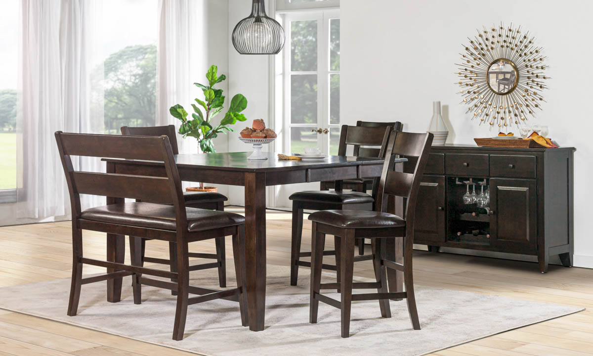 The Davis Home Ohana Dark 5-piece Counter Height Dining Set includes a table with an extension leaf and 4 elegant chairs – all in solid mango wood and a dark merlot finish.