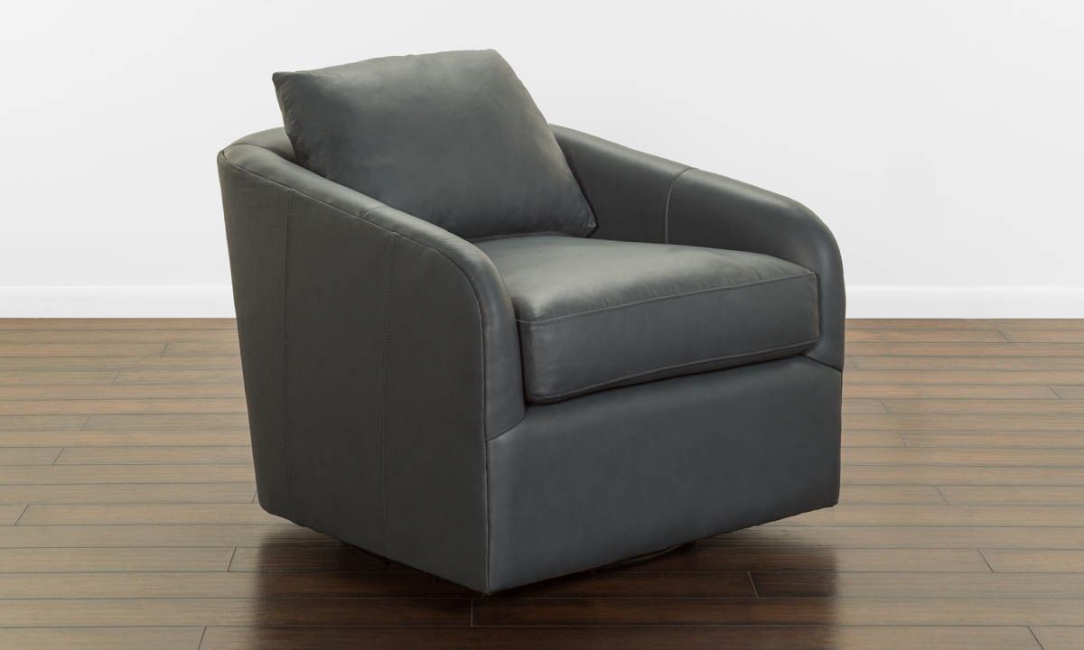 Experience comfort from our Blue Leather Swivel Chair, with eight-way hand-tied construction, luxurious feather down seating, and 100% top grain leather. A perfect addition to any collection of living room chairs.