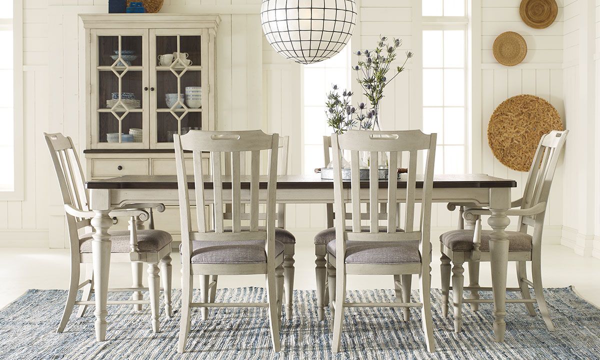 Transitional style and deep discounts are the secret weapons of a happy hostess. The two-toned Brookhaven extendable leg dining room table is made from poplar solids and flat cut elm veneers with contrasting finishes in vintage linen and rustic dark elm. The extendable table seats up to 8 and includes an 18-inch leaf that expands from 62 to 80 inches wide. Slightly distressed and remotely rustic, this table sets the scene for picnic lunches, everyday meals, and holiday feasting.