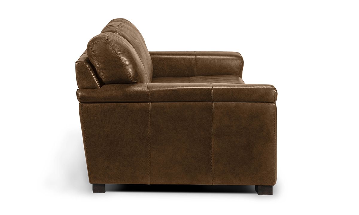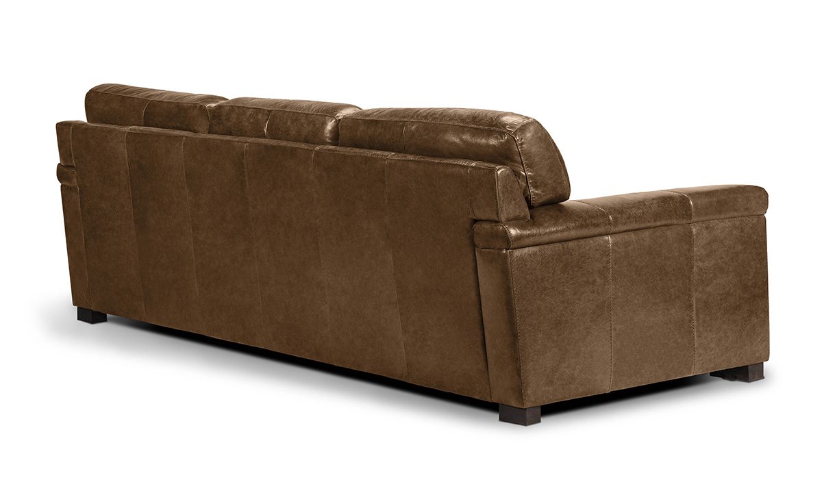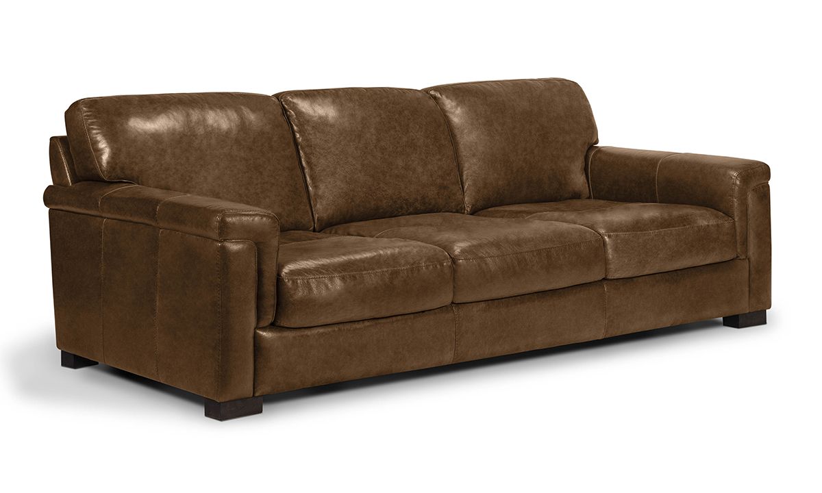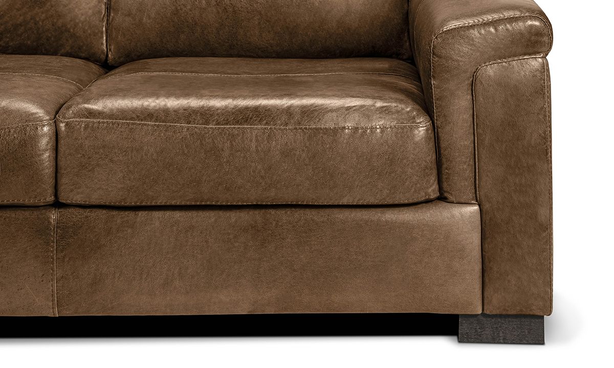 Sublimely comfortably and stunningly handsome, the Medici Chestnut Leather Sofa will instantly elevate the character and style of any living space. Carefully handcrafted in Italy for utmost durability, this oversized 98-inch wide sofa starts with a solid hardwood frame and Pirelli webbed support system, which are then completely enveloped in all over foam padding and topped with plush, high-density foam cushions. Buttery soft top grain Italian leather is hand-tailored to the contemporary, low-slung profile, distinguished by unique layover armrests, distinctive stitching accents and irresistibly deep seats. Warm chestnut brown colored leather softens the modern design while capturing the luxurious look and feel of premium top grain leather, gracefully enhancing over time with everyday wear and age.