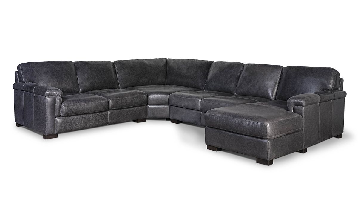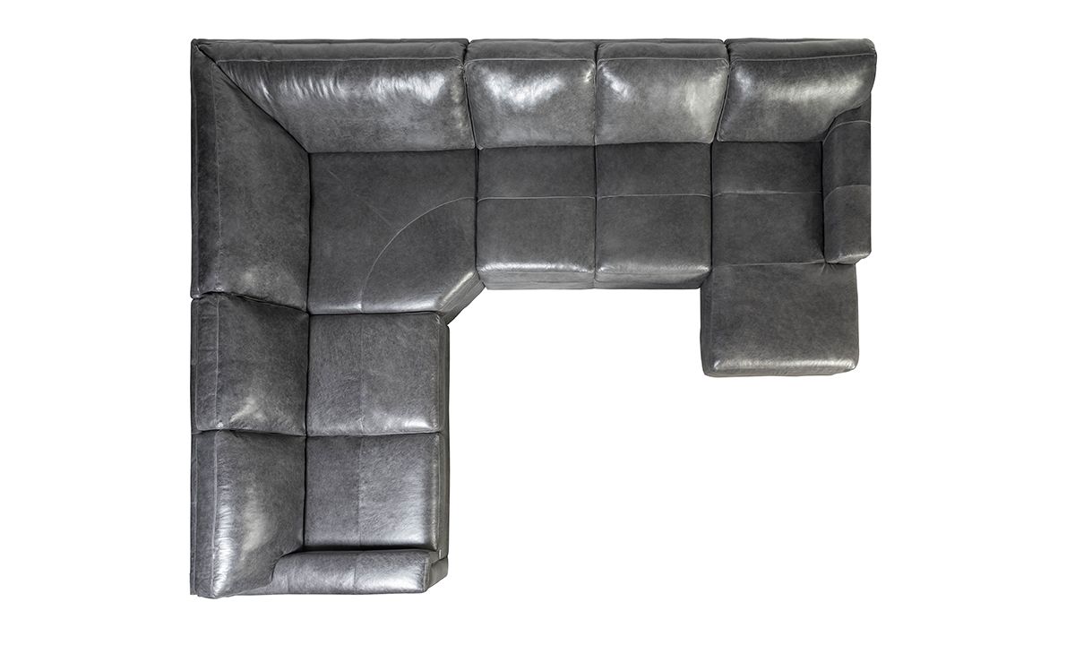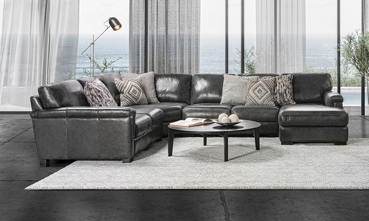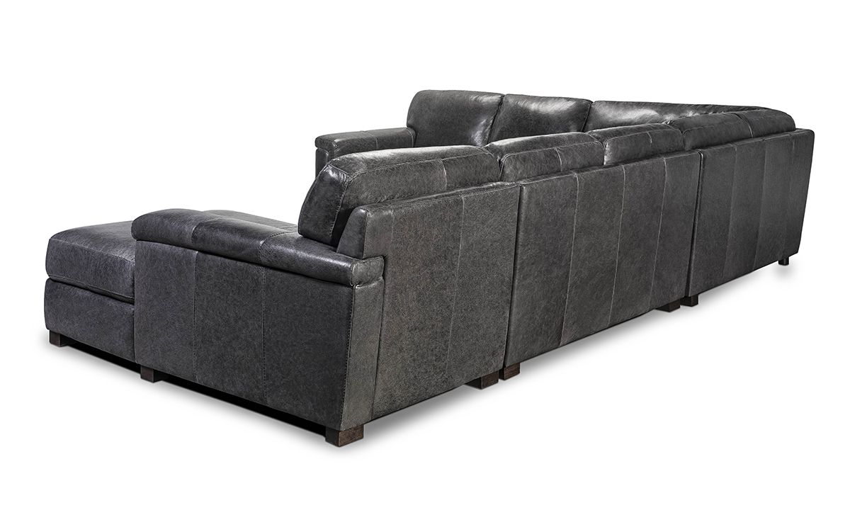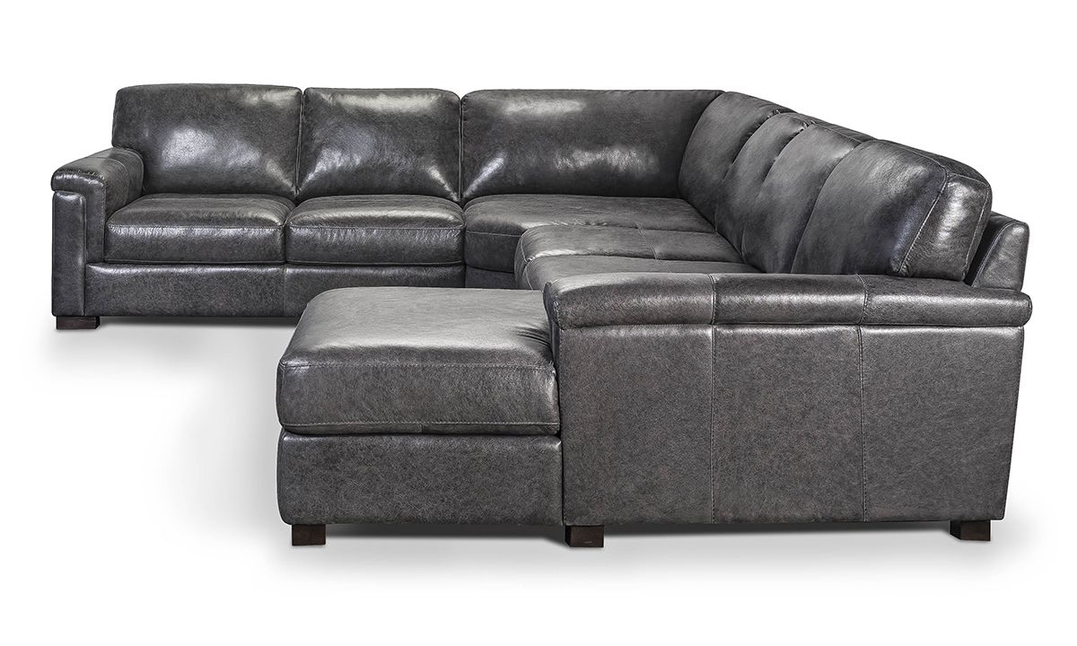 A casual chaise end and spacious corner seating adds to the relaxed sophistication of this four-piece sectional handcrafted in cool dark gray Italian leather.