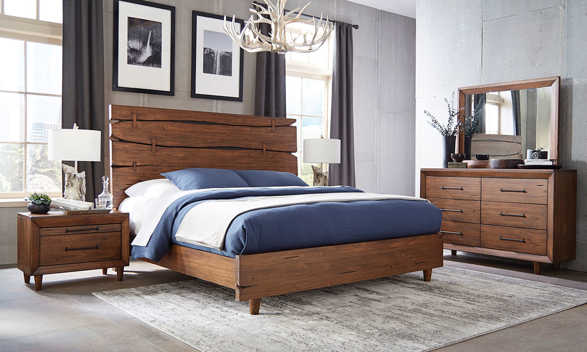 Whether you choose to hang it freely on a wall or attach it to the coordinating Rotta Denver Live Edge 6-Drawer Dresser, the Rotta Denver Live Edge Solid Pine Mirror lends a modern, understated accent to any space. Perfect for opening up the visual space of a living room, bedroom or front hall, this expansive 46-inch wide beveled glass mirror features a clean and streamlined mitered-edge frame. Made from solid Brazilian Pine, the warm Brushed Brown finish draws out the natural woodgrain texture to soften the angular silhouette for a versatile accent piece that will instantly elevate any space.
