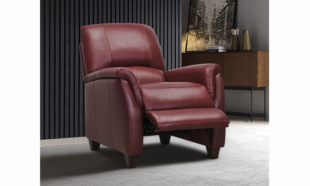 With the looks of a stylish accent chair and the customized comfort of your favorite oversized recliner, the Montclair Garnet Leather Recliner is the perfect choice for a quick nap, weekend lounging or anything in between. A solid hardwood frame and elastic webbed support system are wrapped in plush high-density foam cushions to give the cozy flare arms and bustle back design a sink-into-me softness that will maintain its shape year after year. Rich garnet brown top grain leather lends high-end appeal to the contemporary profile while the convenient pushback reclining mechanism lets you kick back and relax with a simple push.