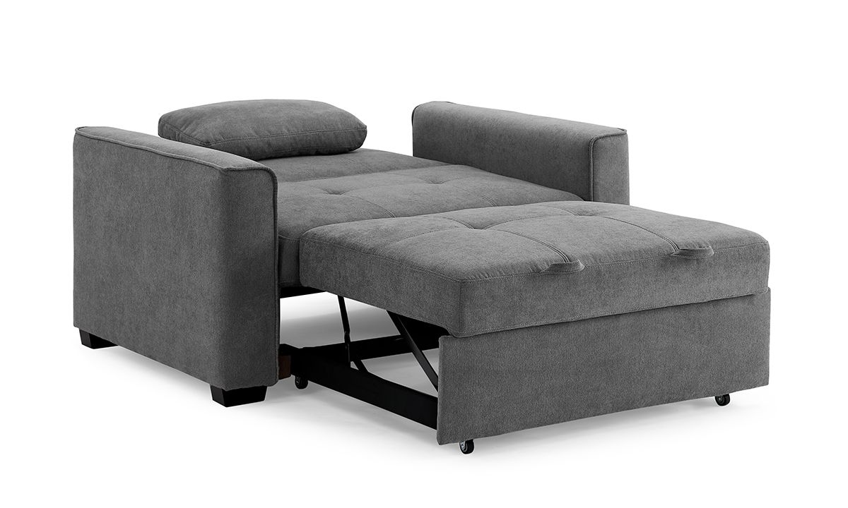 Choose from six different reclined, lounging or lay flat positions with this versatile twin-size sleeper chair featuring contemporary styling and classic light gray fabric upholstery.