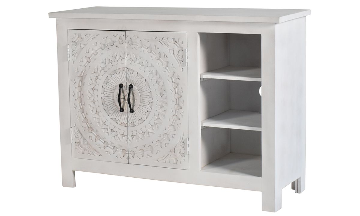 Made in India, this work of art features carved lace solid mango wood and whitewash finish. Details you’ll love include iron hardware, open, concealed fixed shelves, two doors and cord management.