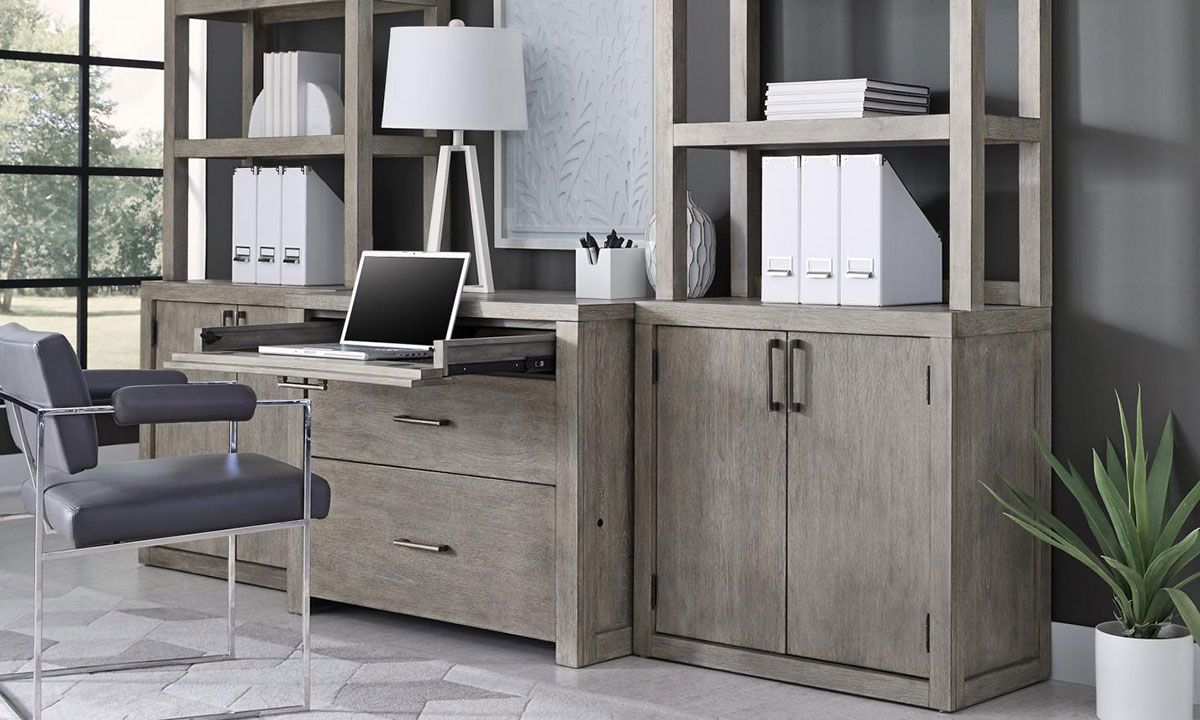Priced just right, the Aspenhome Platinum Grey Linen Workstation and Combo File is a comfortable and contemporary work environment composed of high-quality features and exotic finishes designed to reflect the wood’s unique wood character and natural beauty.