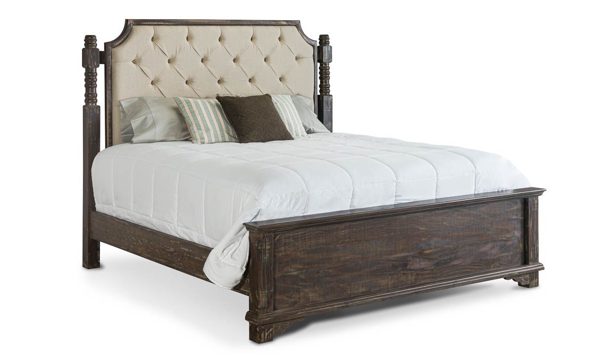 The Charleston Almond 3-Piece Queen Upholstered Bedroom Set is hand-carved from brown Brazilian pine with almond finish and includes bed, tufted headboard, footboard, side rails, dresser and mirror.