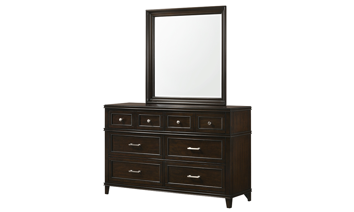 When looking for an accent to your bedroom set, look no further than this elegant Beveled Frame Mirror, that can attach to your matching cherry dresser. Featuring a rich cherry finish and a beveled edge frame design, this mirror adds a touch of elegance to any space. It is crafted with poplar solids and birch veneers for lasting durability. The mirror conveniently attaches to the matching Waterpointe Cherry Dresser, creating a cohesive and stylish look.