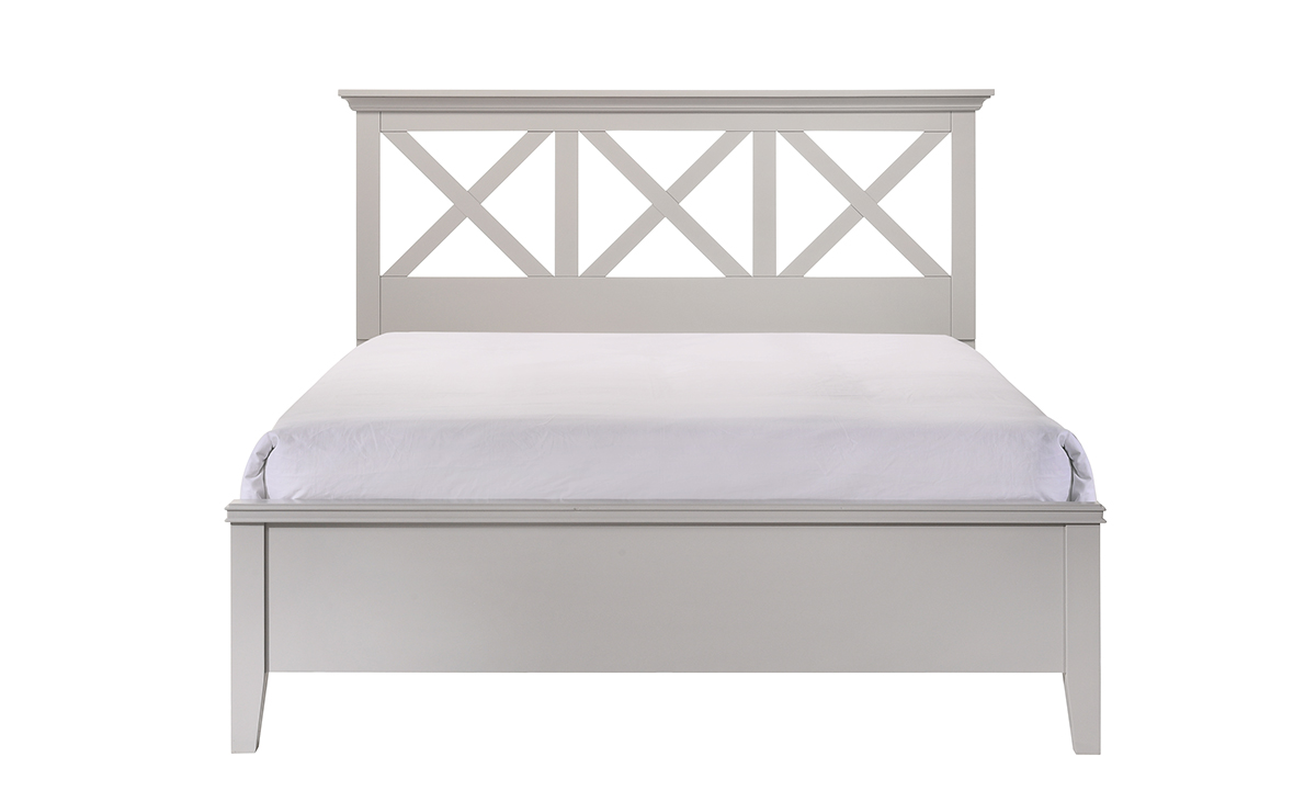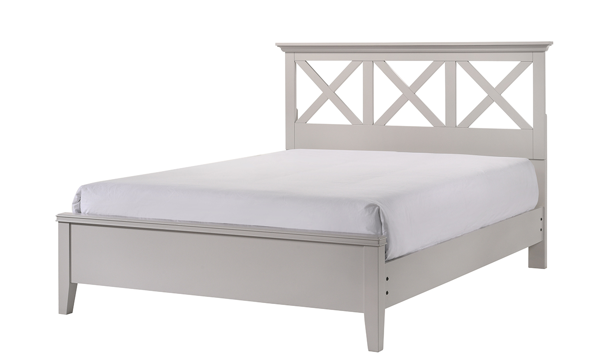 The Soft Gray Queen Panel Bed, crafted from poplar solids and birch veneers, features a low profile footboard and a classic cross pattern headboard, offering a harmonious blend of comfort and style.