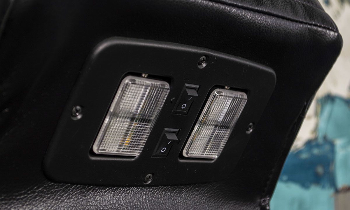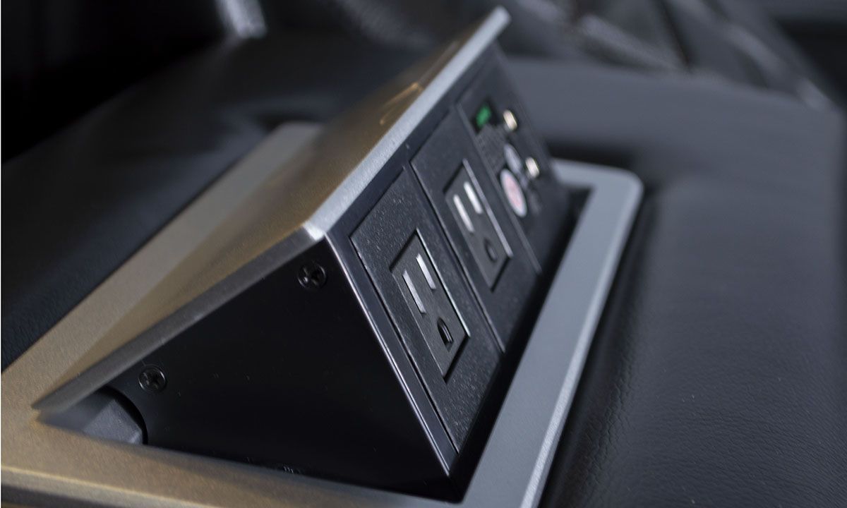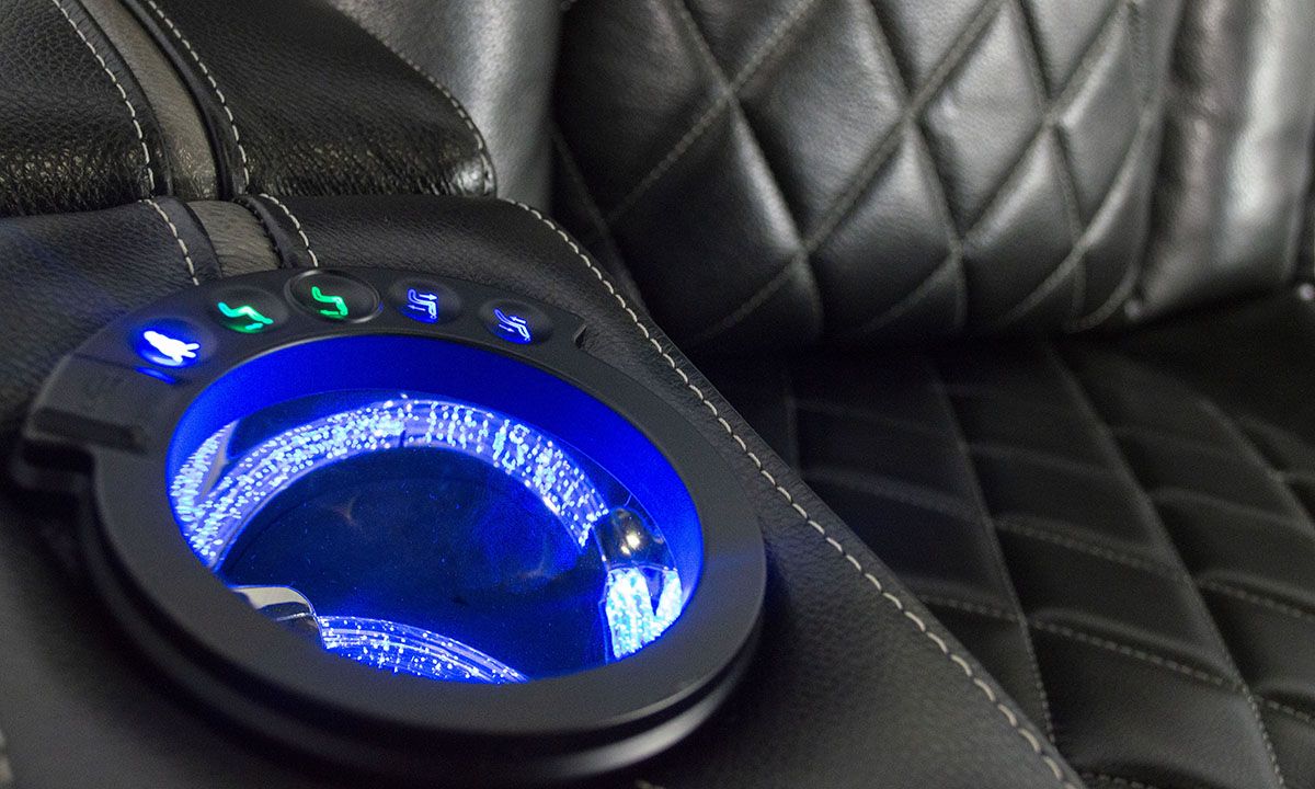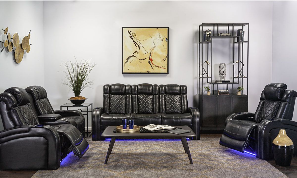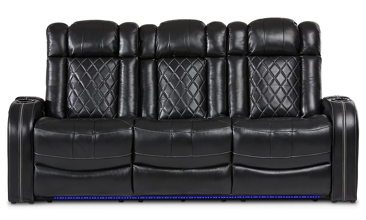 Save big and make TV time a true experience with this leather transformer theater sofa! Both power reclining ends feature a full-leg chaise and power headrest for complete comfort, tailored in quilted black top-grain leather for a luxury look and feel. The armrests come equipped with hidden storage and lighted cup holders, as well as built-in USB ports and contrast color welting for extra style. The center seat back also offers a convenient drop-down table with more cup holders, a pop-up AV charging strip with wireless charging, reading lights and a storage pocket. Whether you’re rooting for your favorite team, bingeing the show everyone’s talking about, or spending hours trying to master that new video game, this souped-up sofa with blue LED-lit underpanel will be the only worthy seat in the house.