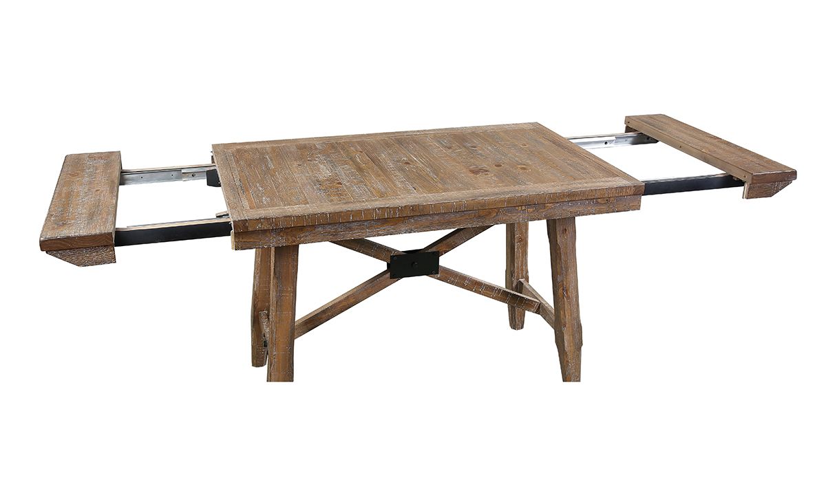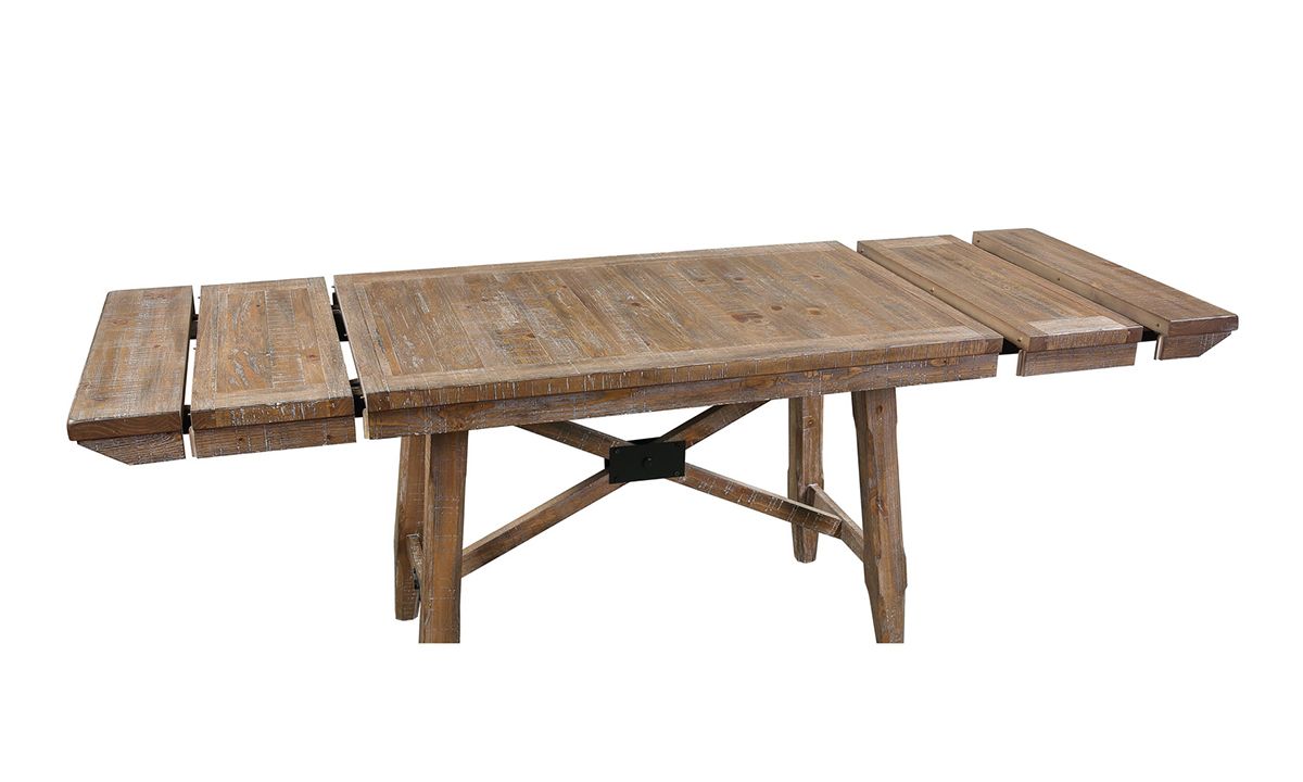 Introduce a centerpiece to your kitchen or dining room ensemble that effortlessly balances rustic, heirloom-quality charm and modern design with the Riverdale Driftwood Dining Table. Crafted from Pine wood solids and rough-cut Pine veneers, the weathered Driftwood finish and saw-rasping distressing technique lend a casual, time-worn charm to the versatile piece. Perfect for effortlessly adapting between study sessions and large family gatherings, the sturdy 72-inch wide table includes two 12-inch extension leaves to expand the table’s surface to 96-inches in a pinch, and features rustic, railroad tie style stretchers beneath for added stability.