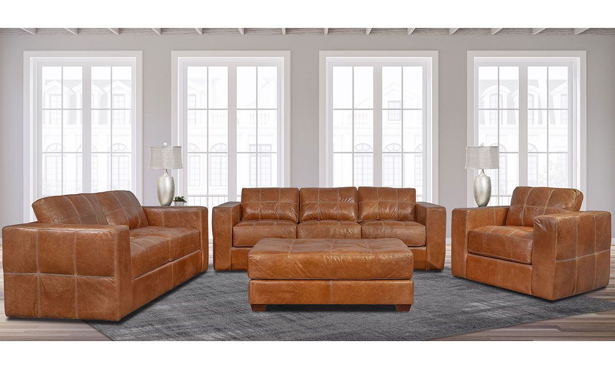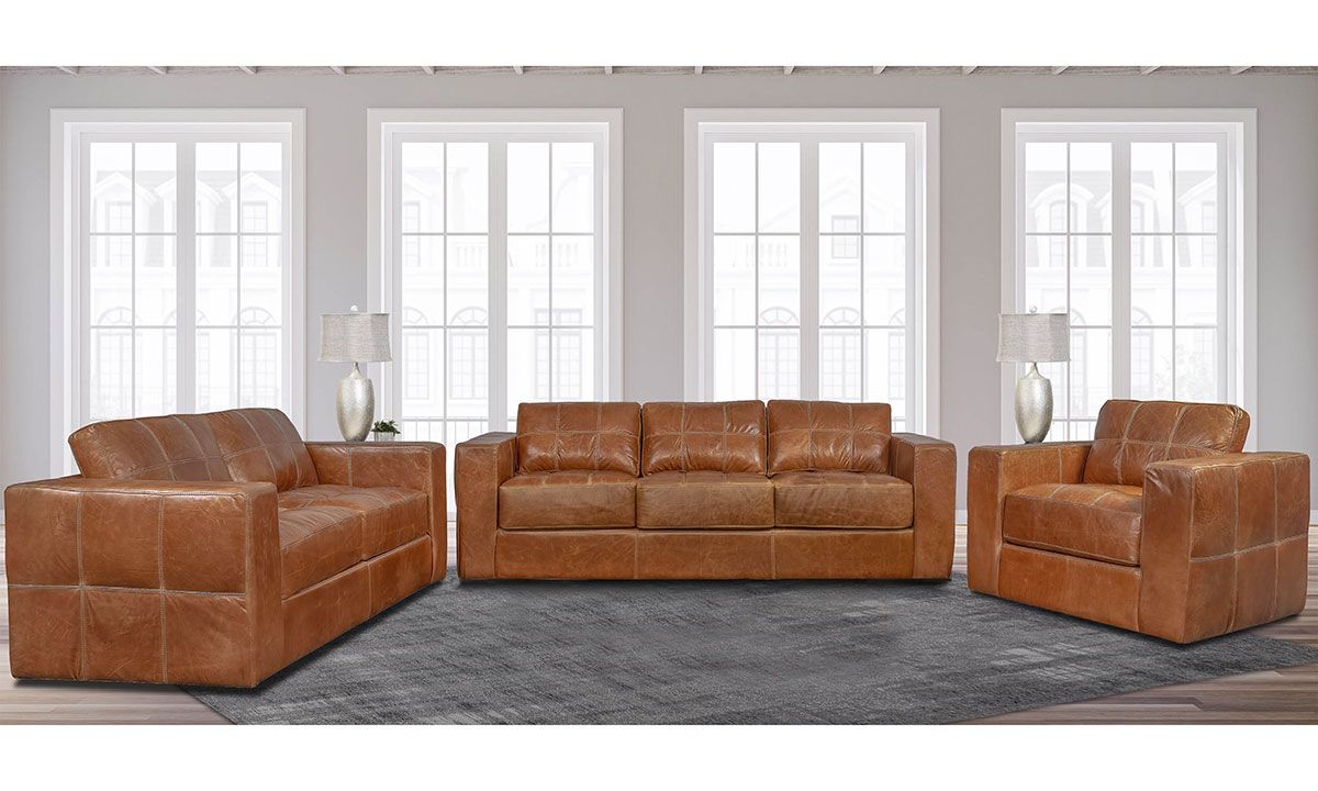 Rocky Mountain gives the contemporary 3-piece Living Room Set silhouette a tailored twist with nuanced details like tufted stitching and classic style track arms, all with an eye on the natural beauty and warmth of 100% top grain leather.