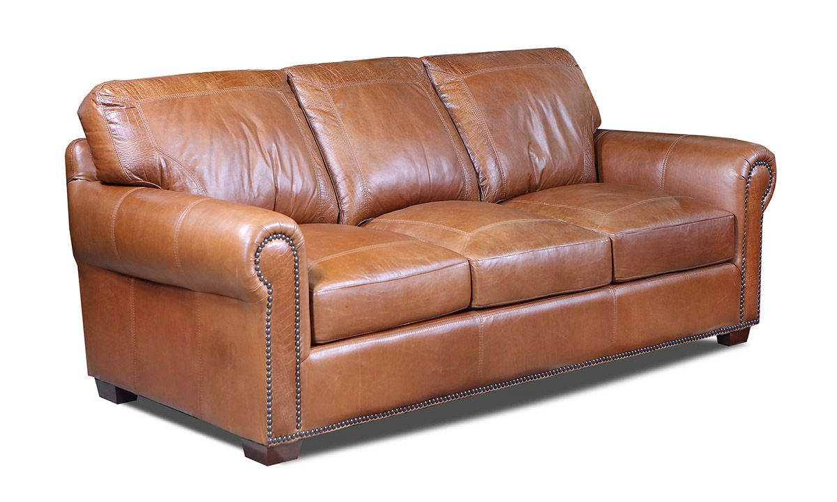 Soon to be your family’s new favorite heirloom, the Rocky Mountain Leather Ketchum Saddle Tan Top Grain Leather Sofa is a study in timeless, sophisticated design with an unexpected edge. Carefully handcrafted in Utah for lasting resiliency, this 91-inch wide sofa starts with a hardwood frame housing the eight-way hand-tied coil spring support unit, each coil individually wrapped in muslin for greater longevity before being wrapped in high-density foam padding and finished with plush, down-blend seat toppers for a pillow-soft feel. Premium 100% top grain leather envelopes the classic, roll-arm style frame, the handsome nail head trim lending a timeless finish touch while alligator embossed paneling on the back cushions brings a wild, unexpected twist to the piece.