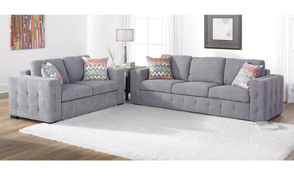 Stretch out in style with the plush, tufted design of the Rowan Gray sofa. Featuring supportive wrapped coil cushions over a durable hardwood frame, the soft grey fabric upholstery lends modern versatility to the angular silhouette. Tufted detailing along the thick track arms and front rail are a fresh, contemporary take on the classic chesterfield style. Two included toss pillows add the perfect pop of color and pattern.