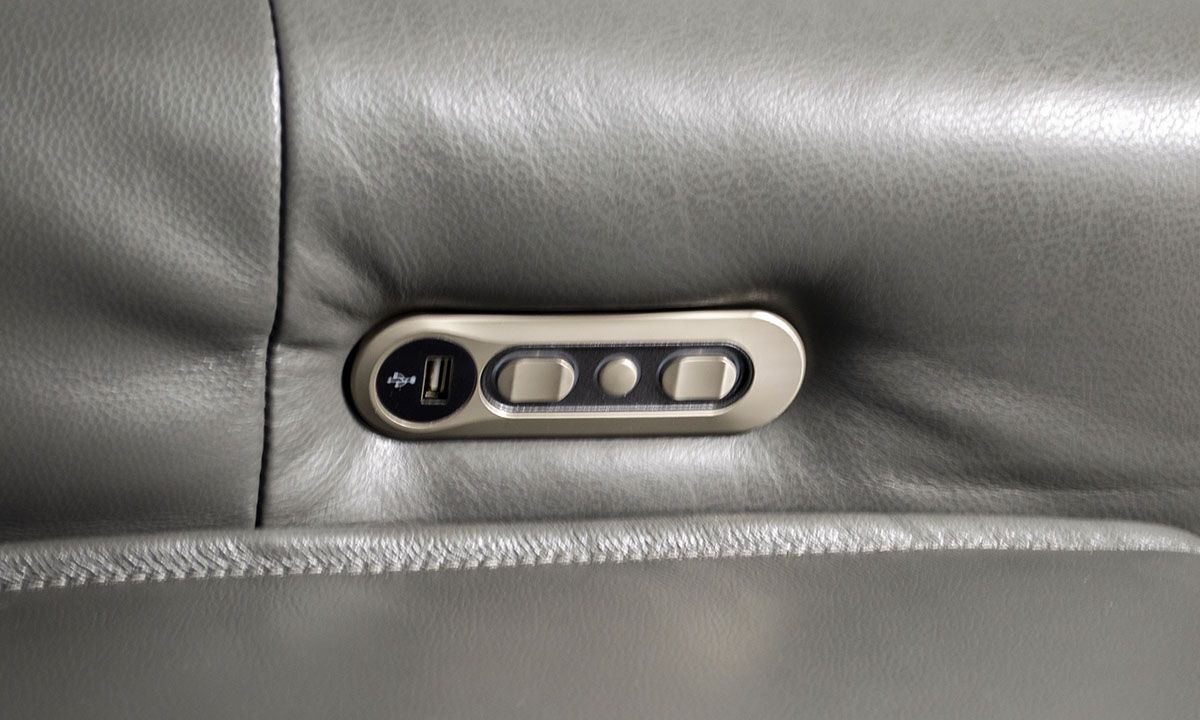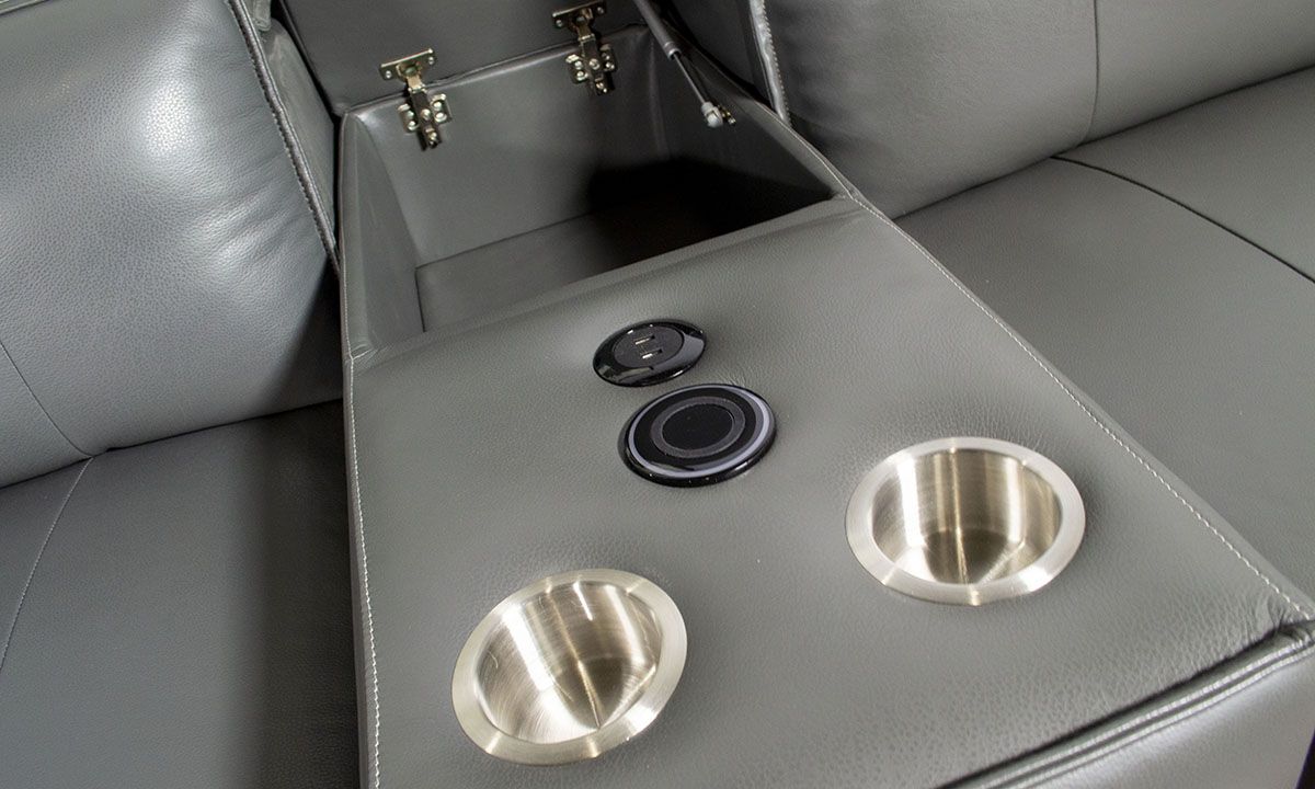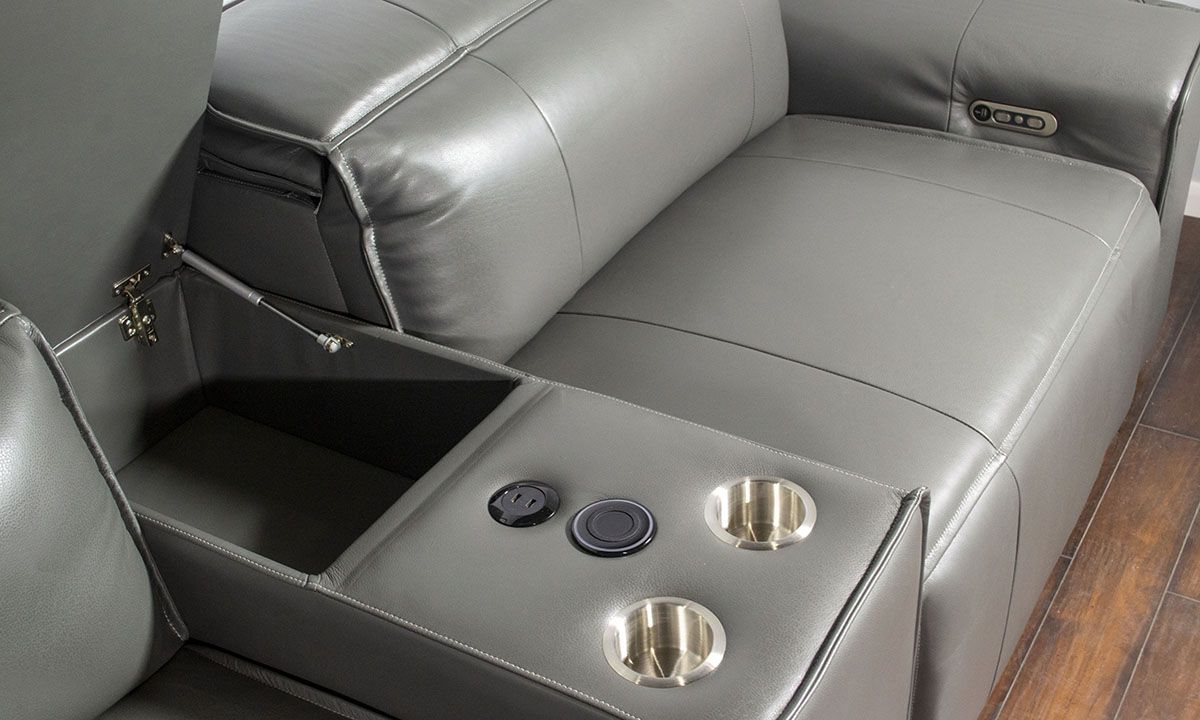 Anchor your living or entertainment space with the smooth style and comfort of the Savant Gray Leather Power Reclining Sectional. Equipped with two power recliners with power headrests that will get you lounging and comfortable with the push of a button, this six-piece sectional also features push-button headrest control on one of the two inner armless chairs and USB charging ports in each control panel. A decked-out storage console keeps all your entertainment essentials close at hand thanks to a roomy storage compartment, wireless charging pad, two USB charging ports, reading lamp and two cupholders. Ideal for updating your modern abode, the sleek, low-slung profile and soft gray leather cover lends contemporary appeal to any living space.