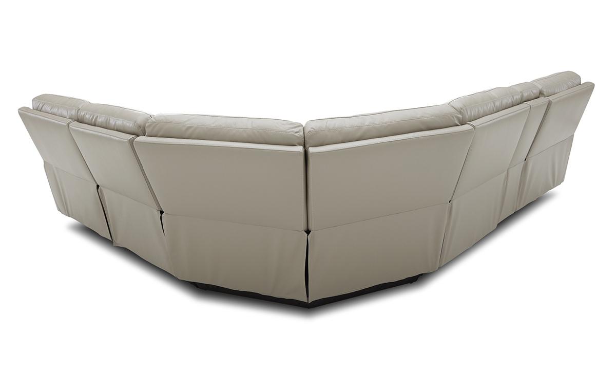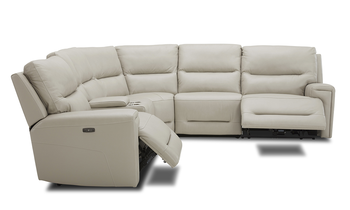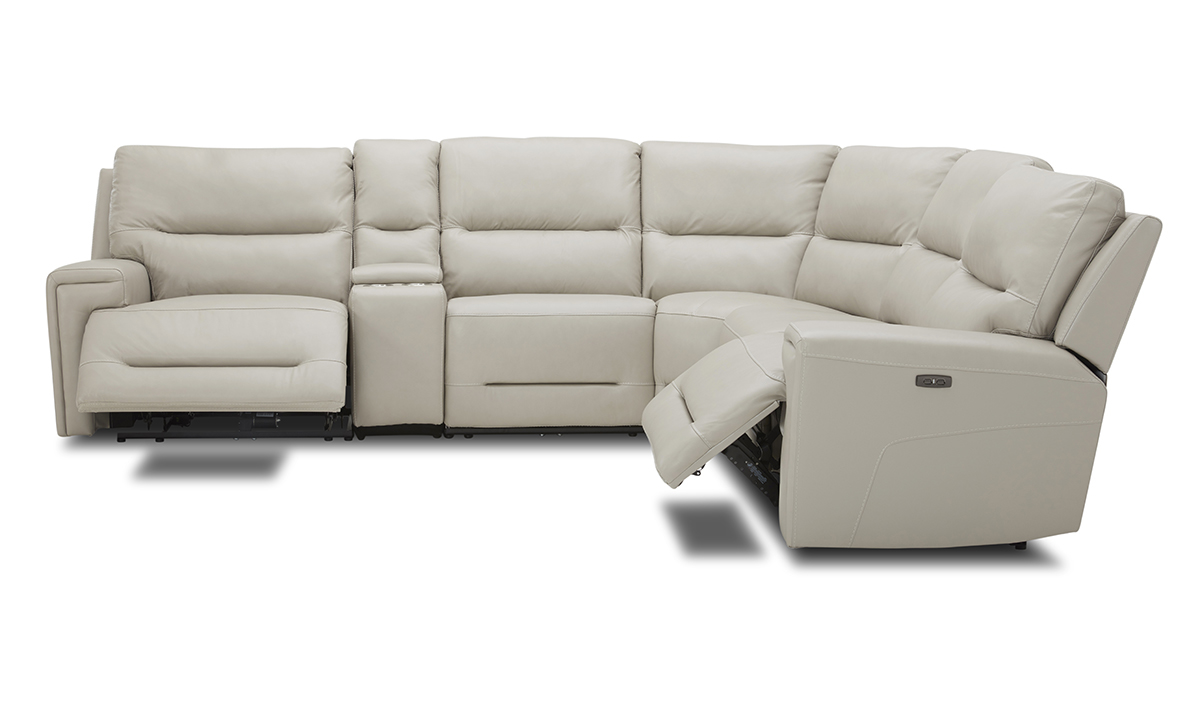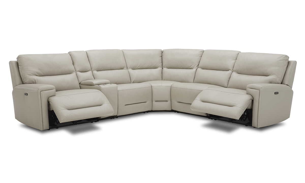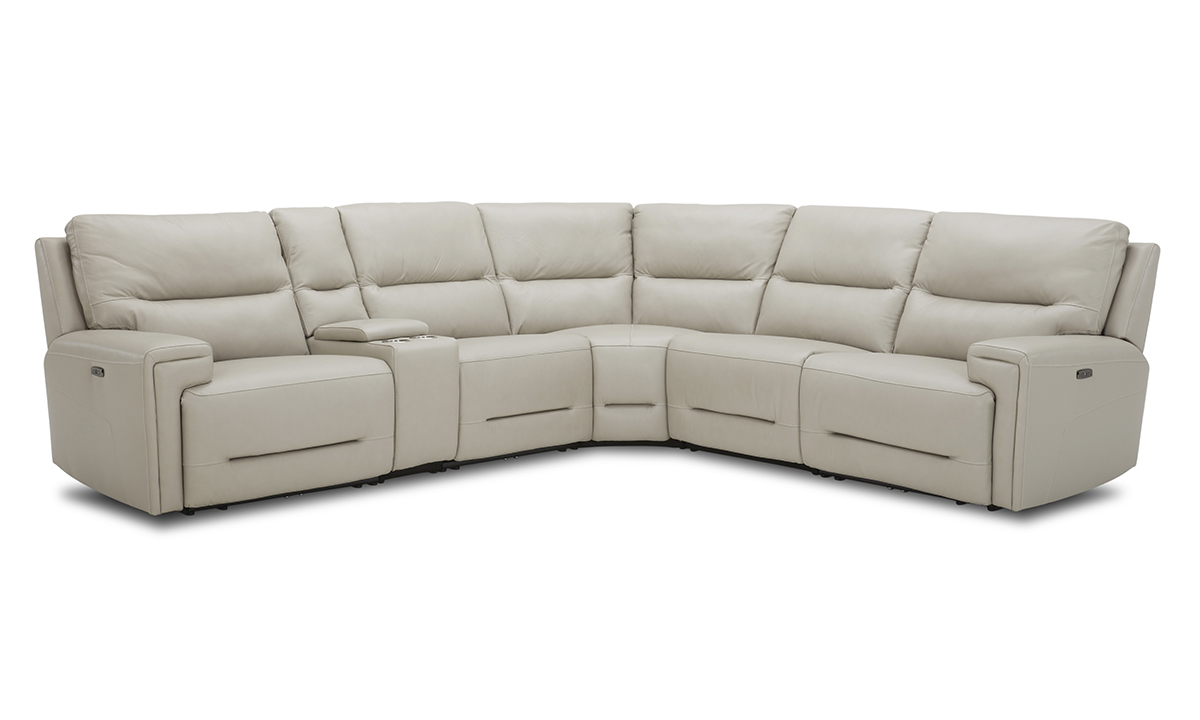 Six-piece sectional pairs luxurious cream-colored leather upholstery with the comfort of three power recliners with power headrests.