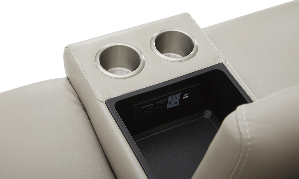 Upgrade your living room or entertainment space with the premium comfort and design of the Thatcher Cream Leather Power Reclining Sectional. Crafted to keep its shape and looks for years, this six-piece sectional is constructed with sturdy hardwood frames and sinuous spring support systems and then wrapped in plush high-density foam cushions. Distinguished by sleek foldover armrests and bustle back seat cushions, the contemporary profile is tailored in sumptuous cream-colored top grain leather. Push button control panels allow you to customize your reclined and headrest positions in three of the five seats while a convenient storage console with power outlets, USB charging ports, storage and cupholders keeps all your relaxation essentials neatly organized.