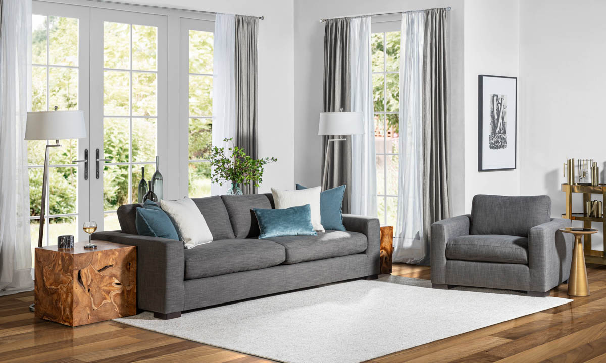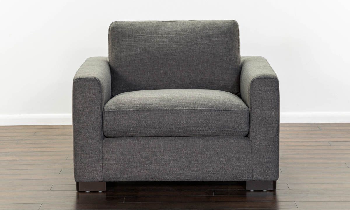 Elevate your decor with the Sable Smoke Chair, featuring Effie Smoke performance fabric, feather and down comfort, and a sinuous spring system for a perfect blend of modern style and luxurious relaxation.
