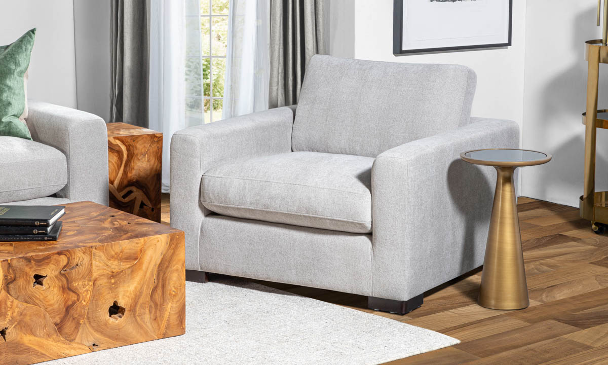 Elevate your living space with the Sable Dove Chair, featuring luxurious Elite Dove performance fabric, feather and down filling, and a sinuous spring system for a perfect mix of comfort and contemporary style.