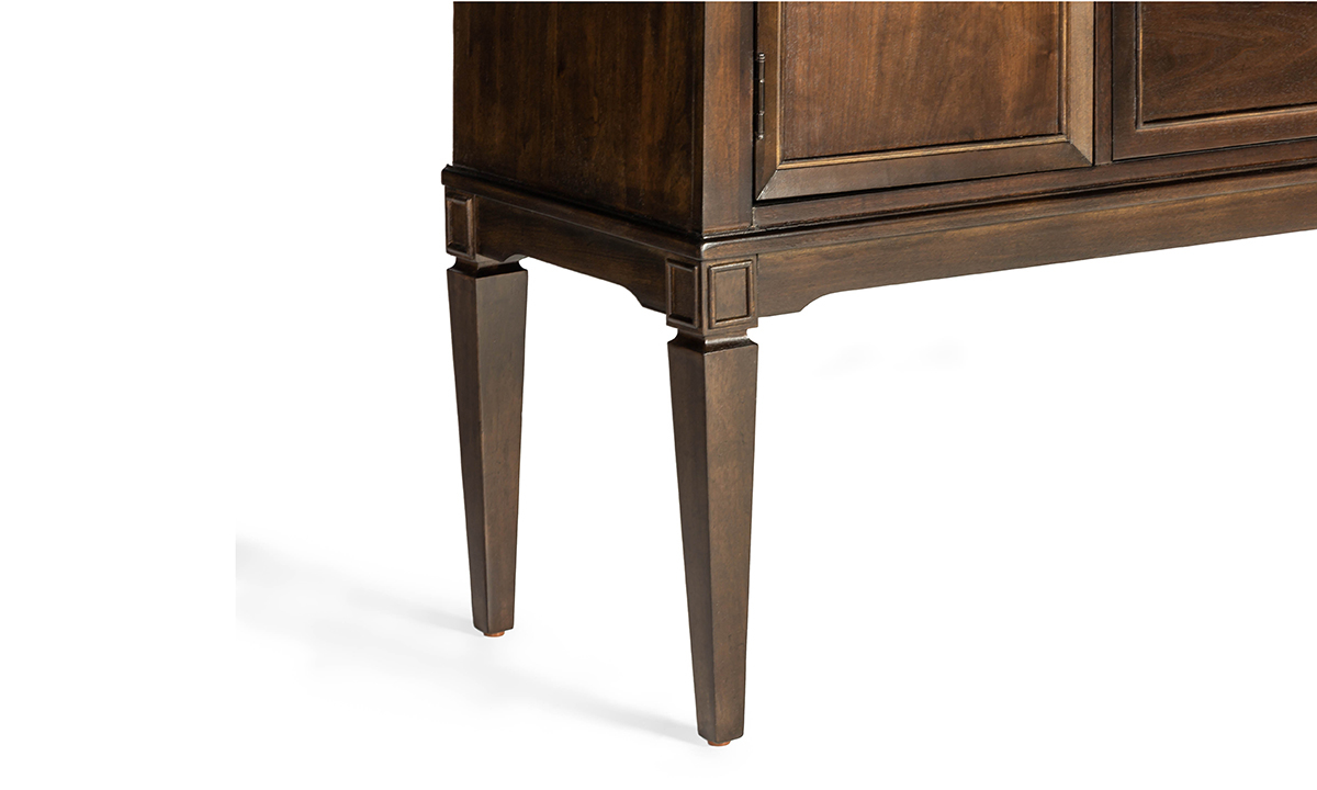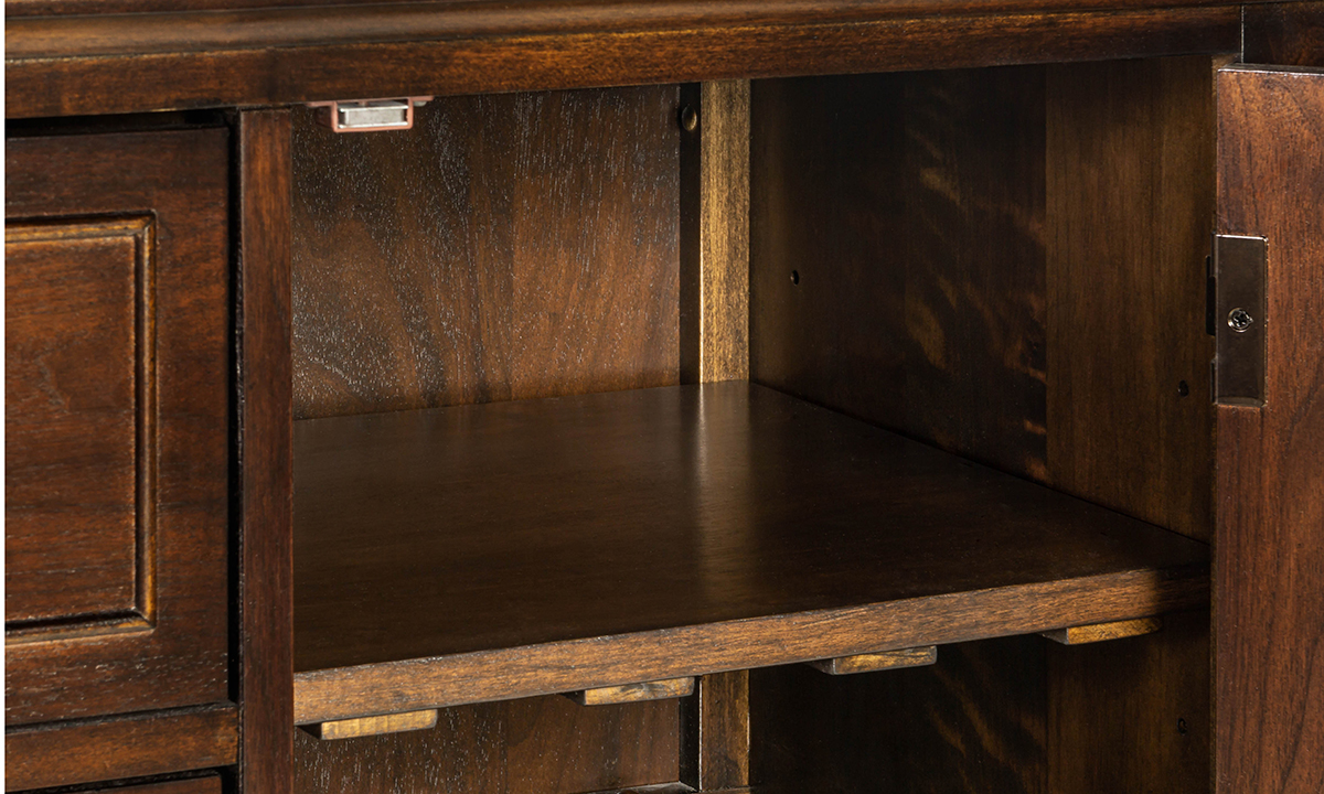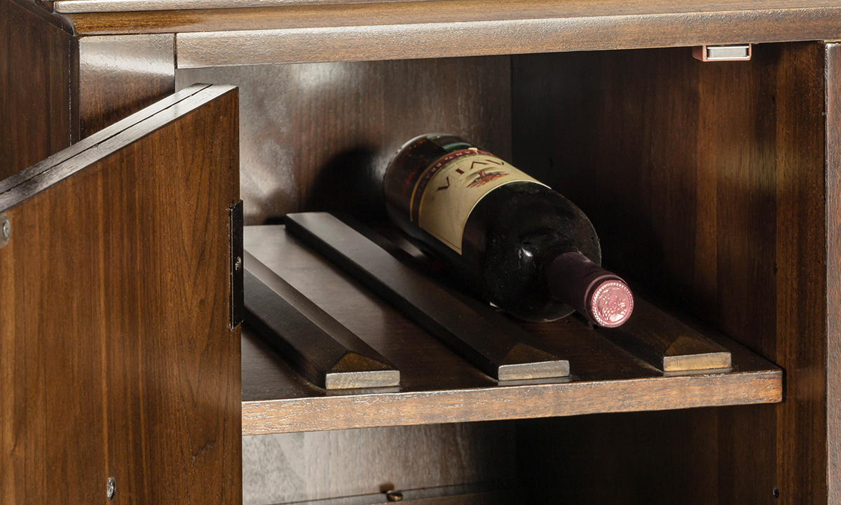 As the finishing touch to your dining room ensemble or a helpful companion in a kitchen or entertainment space, the Kensington Walnut Sideboard marries flexible storage with subtly traditional design. Meticulously crafted from sturdy Poplar solids and Walnut veneers, this 58-inch wide sideboard features a hand applied Moderne Walnut finish, accentuating the natural woodgrain in the veneers. The two outer cabinets, concealing a removable storage shelf and bottle rack, and two central storage drawers keep all your entertaining essentials close at hand and neatly tucked away. Subtle finishing touches, like the champagne-hued hardware and sophisticated tapered legs gives this piece a laid-back sophistication that will instantly elevate any ensemble.