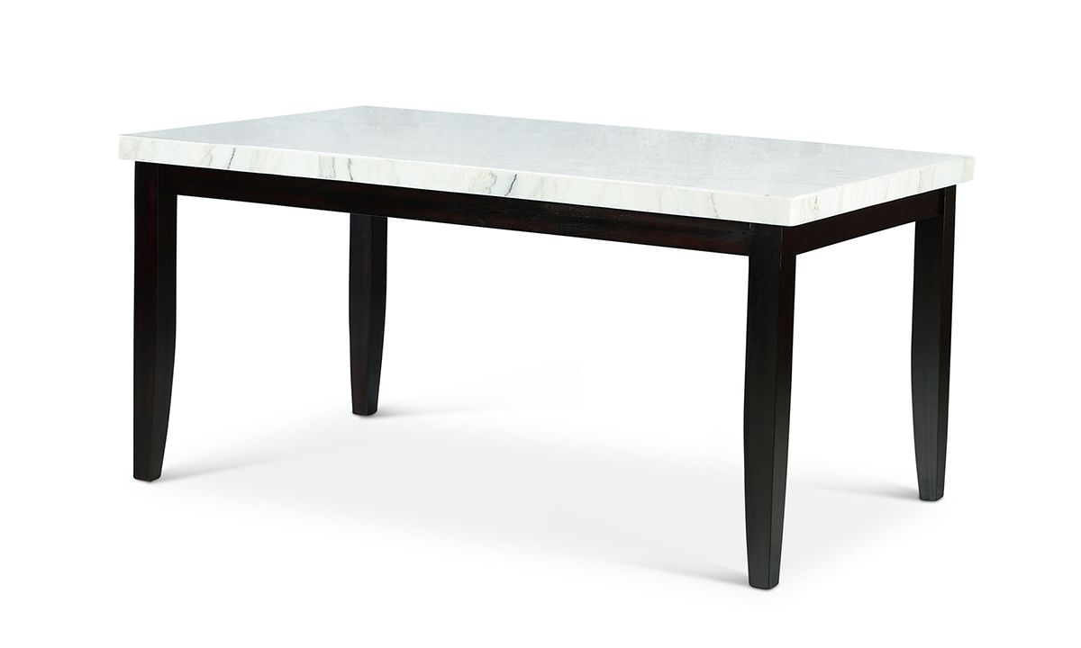 Stunning 64-inch dining table pairs slender tapered legs in a chic, Ebony black finish with a luxe white marble surface for a modern take on the timeless black and white palette.
