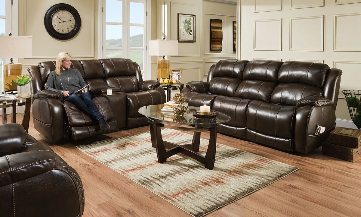 Made in America from top grain brown leather with leather-look fabric match on back and outer sides for worry-free enjoyment, the full living room set features four recliners with extended footrests, remote controlled power reclining, headrest, and lumbar with storage pockets, and pillowtop armrests.